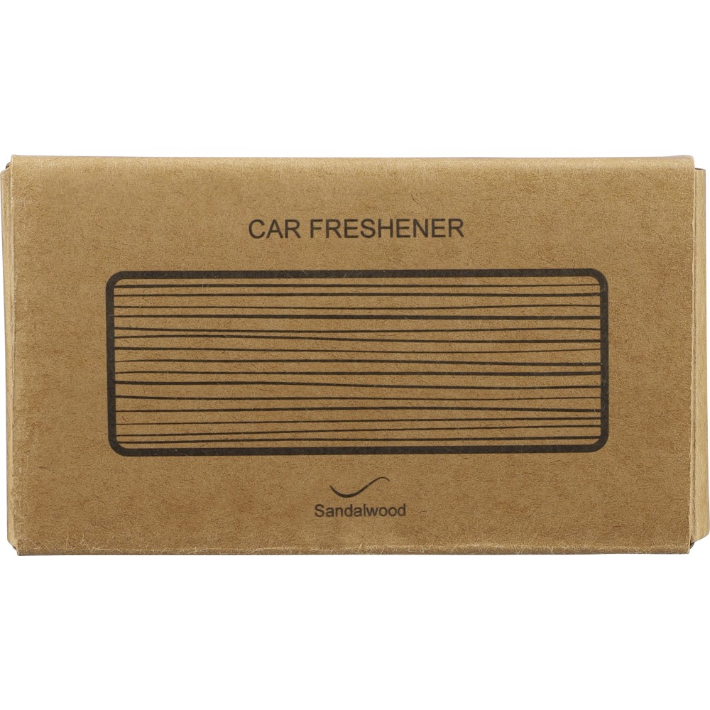 Natúr bükkfából készült autós légfrissítő, 2 × 3 g alkoholmentes szantálfa illattal (egy előre töltve, egy utántöltőként). ABS csipesszel ellátva a szellőzőrácsra történő rögzítéshez. Illusztrációval ellátott barna kartondobozba csomagolva.