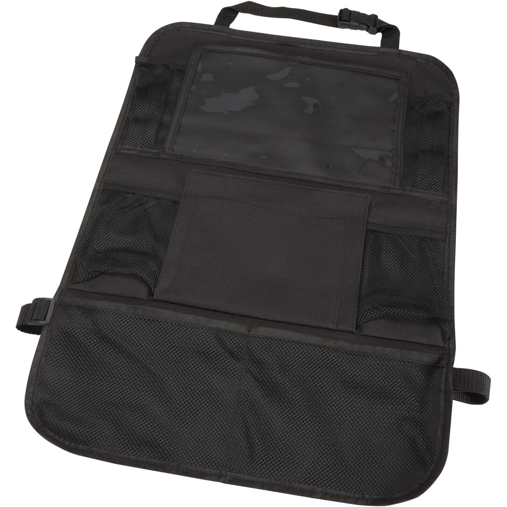 Autós háttámla-rendszerező, amely több hálós zsebbel rendelkezik az alapvető kellékek, például snackek, játékok vagy palackok tárolására, valamint egy PVC-ablakkal tablet számára. Könnyen az első üléshez rögzíthető, és segít rendben, illetve rendezetten tartani az autót - ideális választás családoknak, utazásokhoz vagy mindennapi használatra.