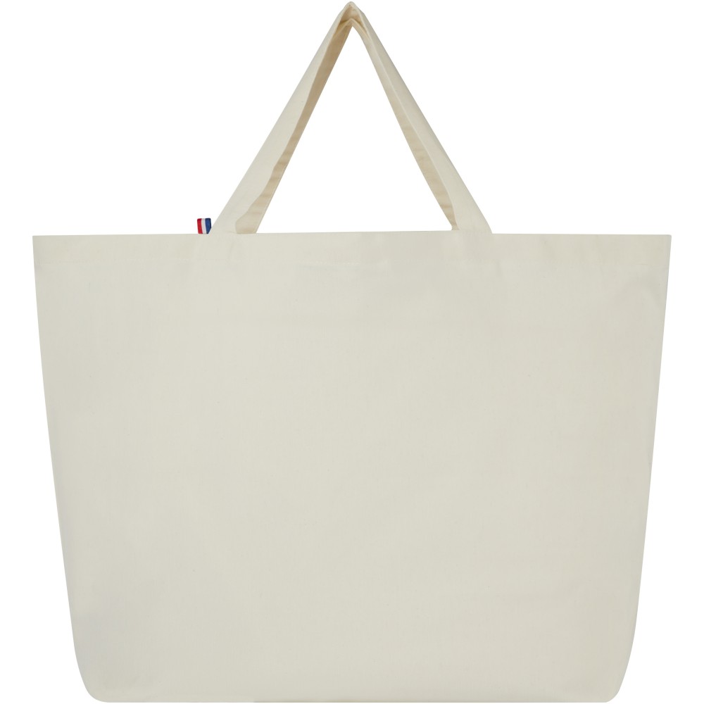 Ez a nagy táska a legfinomabb kidolgozású, 100%-ban újrahasznosított anyagokból készült. A mindennapi életben való használatban alkalmas nehéz könyvek vagy bevásárlások szállítására. A 200 g/m2-es újrahasznosított pamut/poliészter keverék biztosítja a tartósságot és a megbízhatóságot, így a táska akár 14 kg súlyt is elbír. Az alapanyag Ázsiából származik, de a szövés és a gyártás Franciaországban történik.