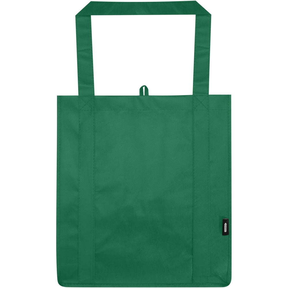 A Liberty GRS tanúsítvánnyal rendelkező újrahasznosított bevásárlótáska tartós és szakadásálló nem szőtt RPET anyagból készült, megerősített aljrésszel, amely extra stabilitást és sokoldalú felhasználást biztosít. A táska nagy méretű főrekesszel és 25 cm hosszú fülekkel rendelkezik, így kényelmesen hordozható. Űrtartalma: 29 liter. Teherbírás: akár 12 kg.