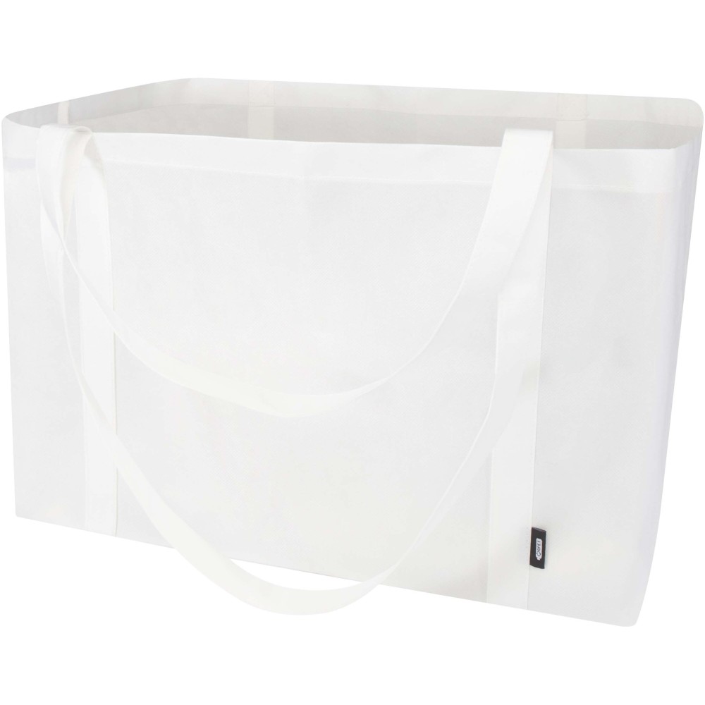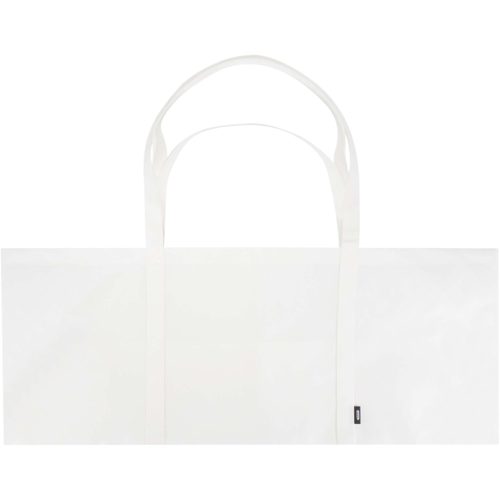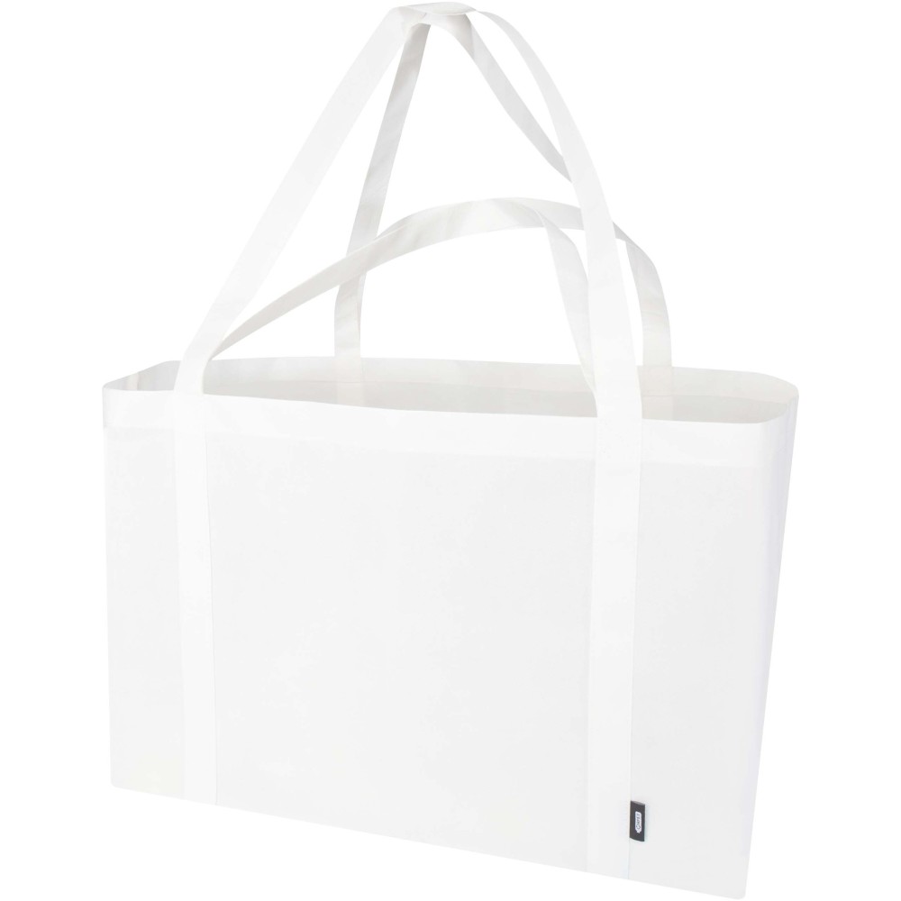 A Jumbo GRS tanúsítvánnyal rendelkező újrahasznosított bevásárlótáska tartós és szakadásálló nemszőtt RPET anyagból készült, extra nagy, akár 65 literes kapacitással rendelkezik, így ideális nagybevásárláshoz, strandoláshoz vagy kirándulásokhoz. Megerősített rövid (24 cm) és hosszú (37 cm) fülekkel van ellátva a maximális kényelem érdekében. Könnyen összehajtható és tárolható, ha nincs használatban. Teherbírás: akár 15 kg.