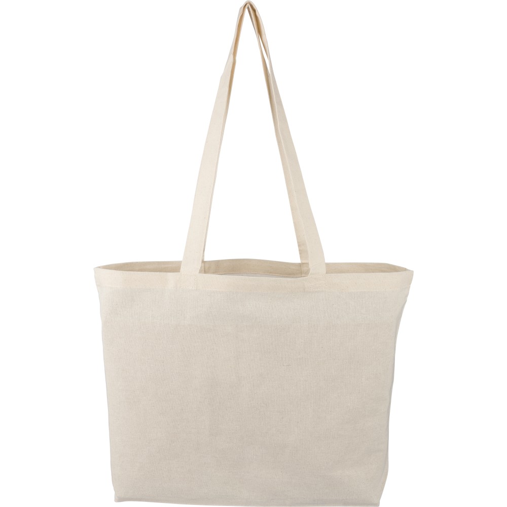 Oeko-Tex minősítésű, 140 g/m2 pamutból készült natúr színű bevásárlótáska, 48 × 34 × 10 cm méretben, 70 cm hosszúságú és 2,5 cm szélességű fülekkel. Oeko-Tex címkével ellátva.