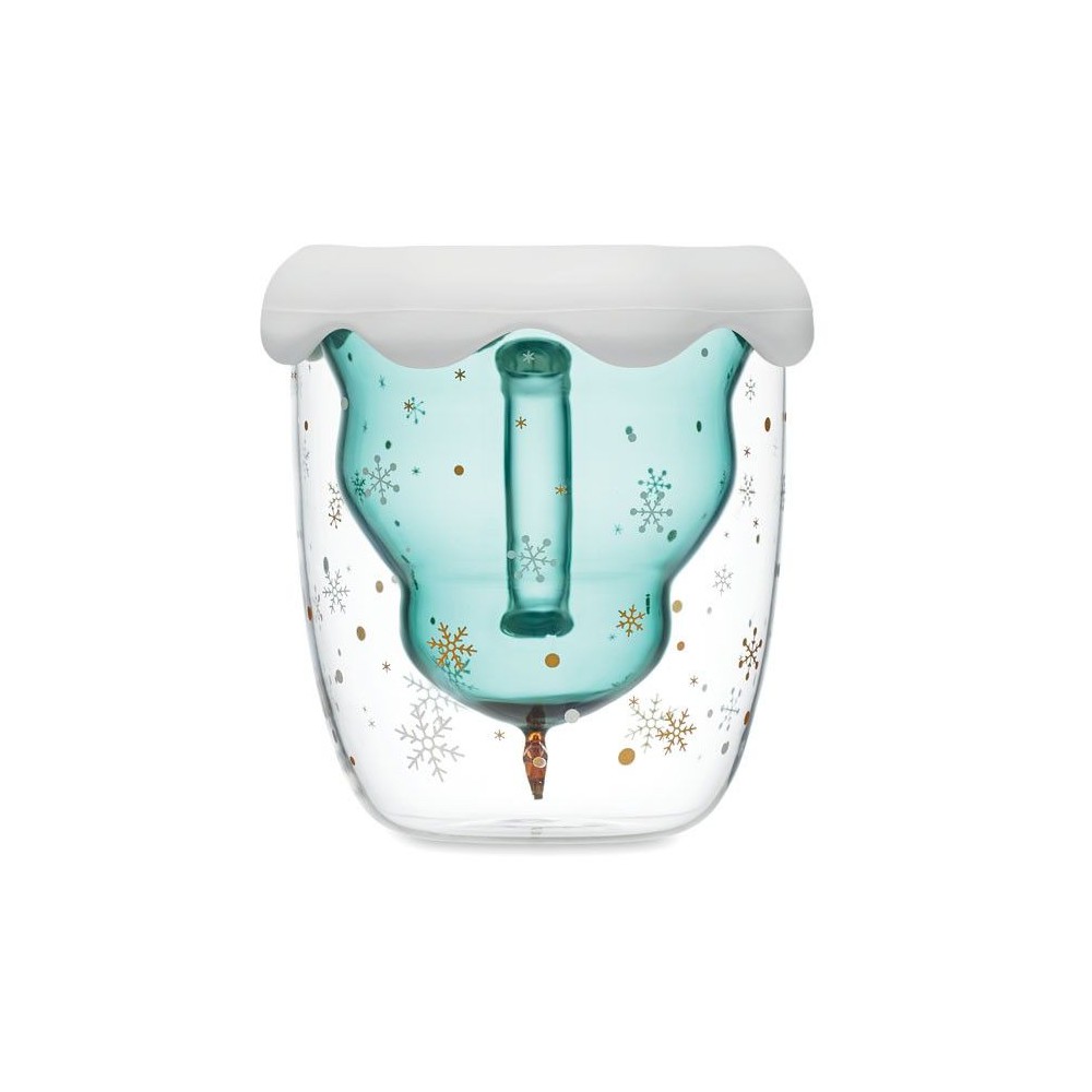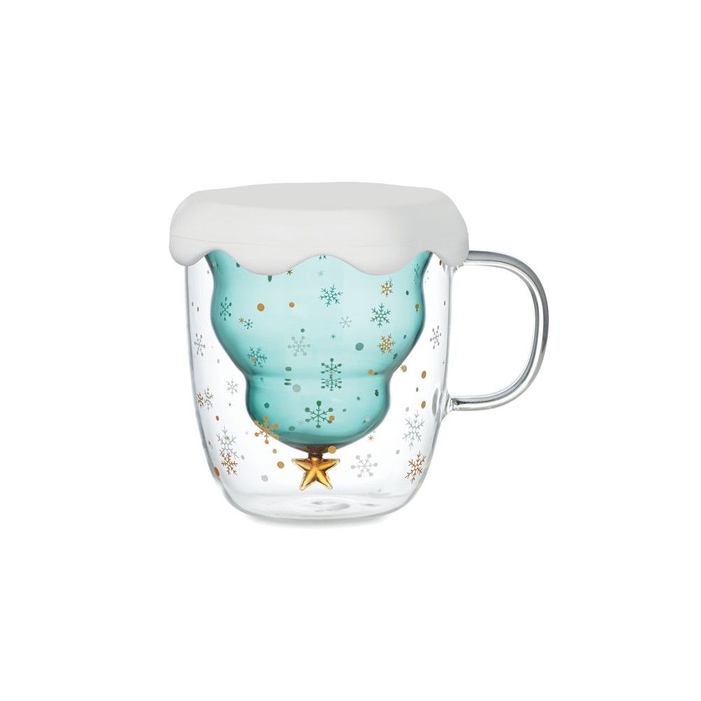 Duplafalú boroszilikát bögre ünnepi mintával, poháralátétként is használható szilikon fedővel. Űrtartalom: 250 ml.