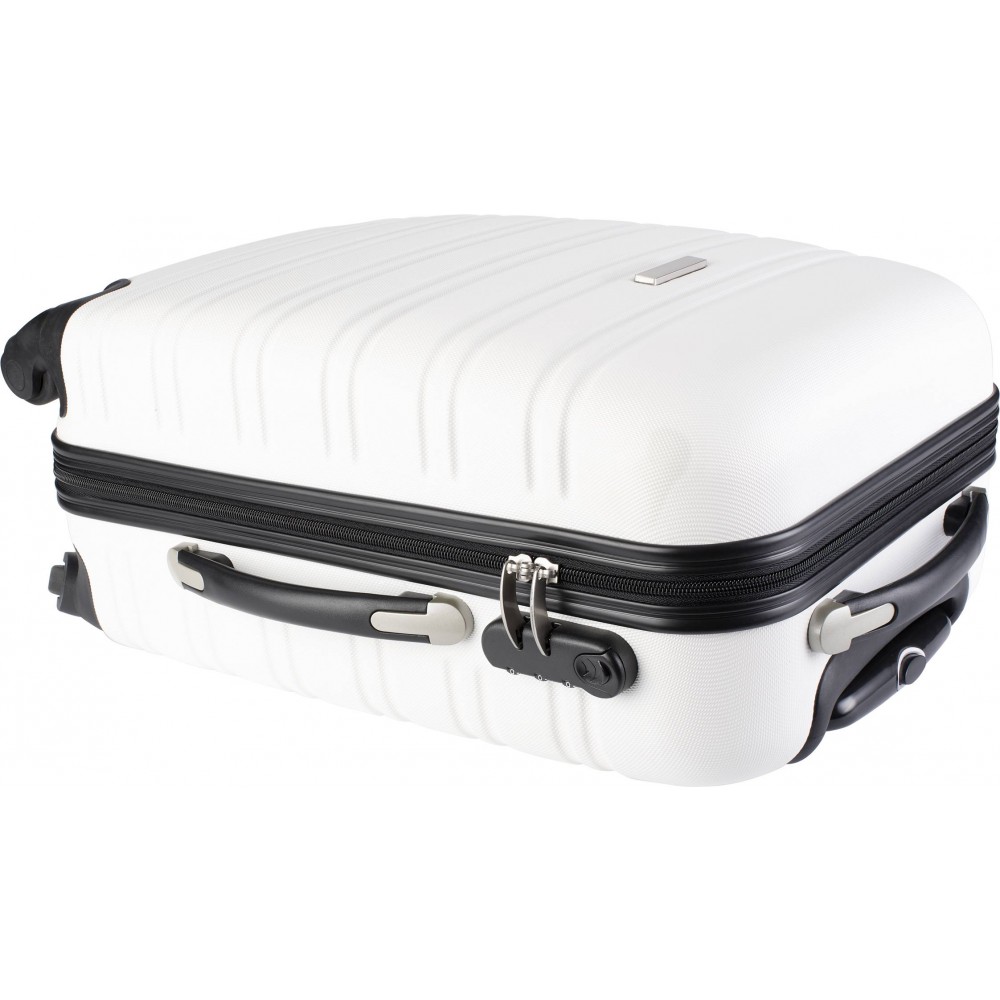 Keményfedelű bőrönd ABS műanyagból, 4 körbeforgó kerékkel, beépített számzárral. Emblémzásra alkalmas fémlapot tartalmaz.