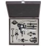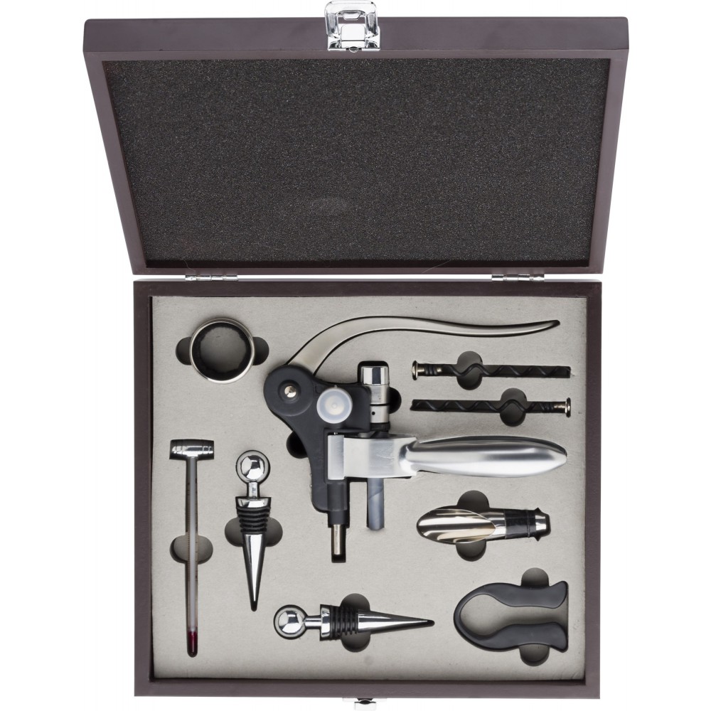 Boroskészlet kilenc eszközzel: két üvegdugó, cseppfogó, hőmérő, fóliavágó, tölcsér és dugóhúzó fa dobozban. Fa és BPA-mentes műanyag.