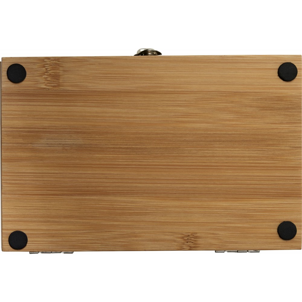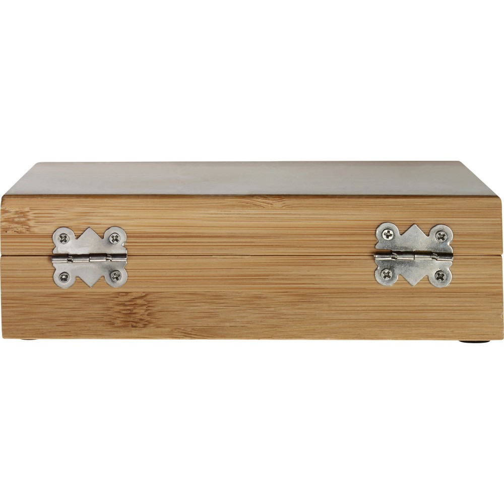 Boroskészlet. Tartalma: pincérbicska, üvegdugó, cseppfogó. Csomagolása bambusz díszdoboz. Bambusz és BPA-mentes műanyag.