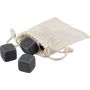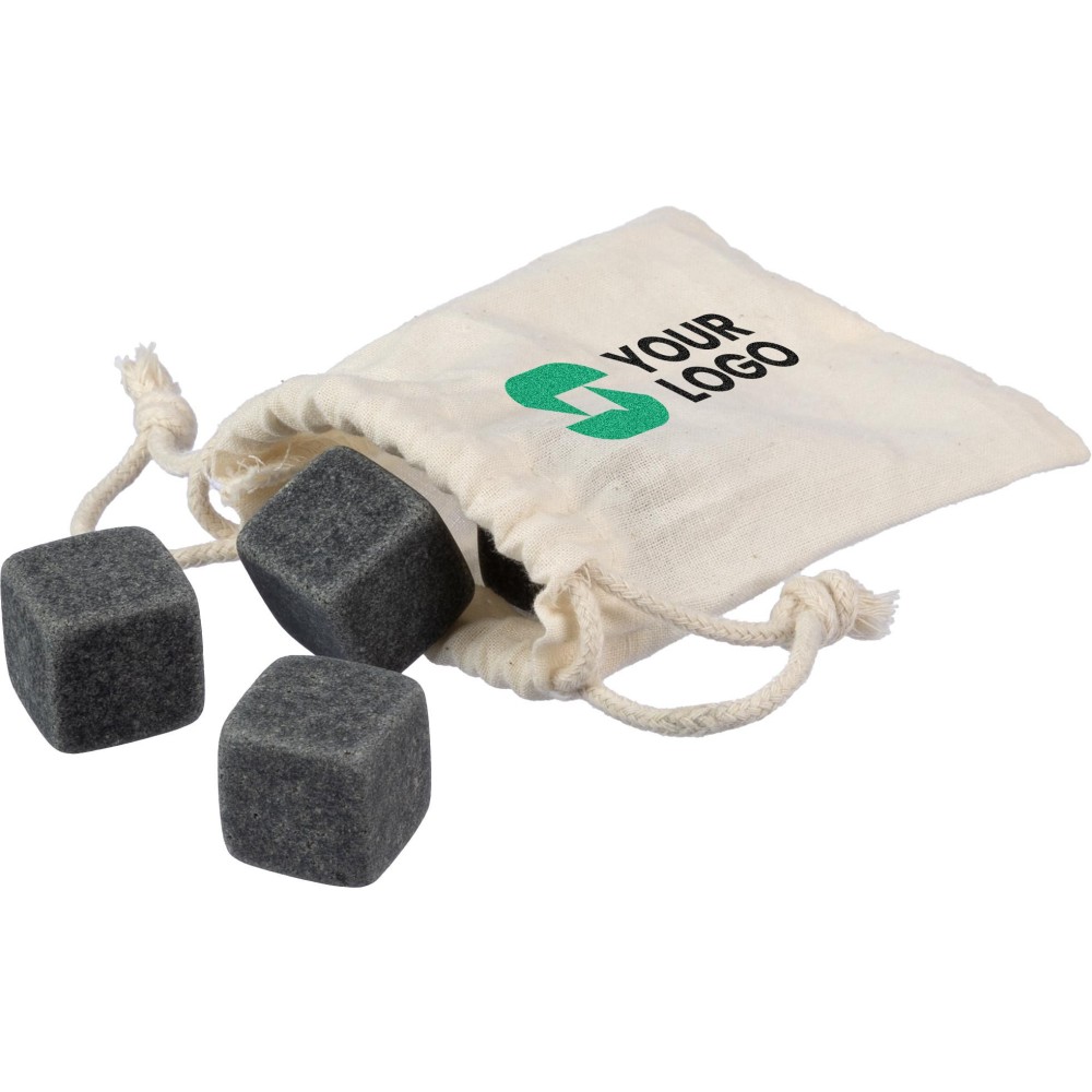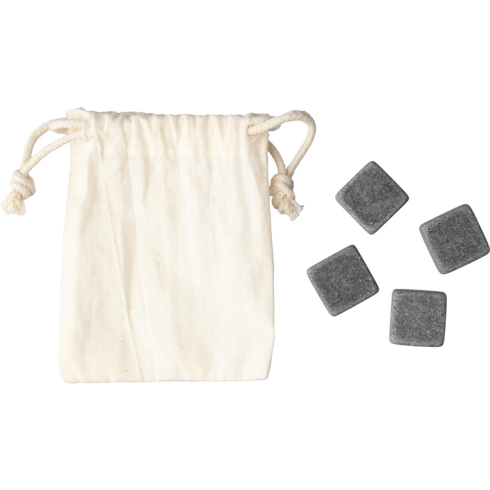 Kőkocka készlet jégkockák helyett. 4 db újrafelhasználható természetes kőből álló kockakészlet. A köveket hűtőbe kell tenni, hogy lehűljenek. Pamut zsinóros tasakban csomagolva érkezik.
