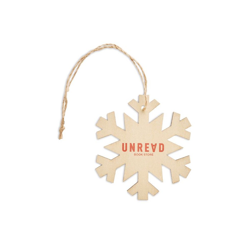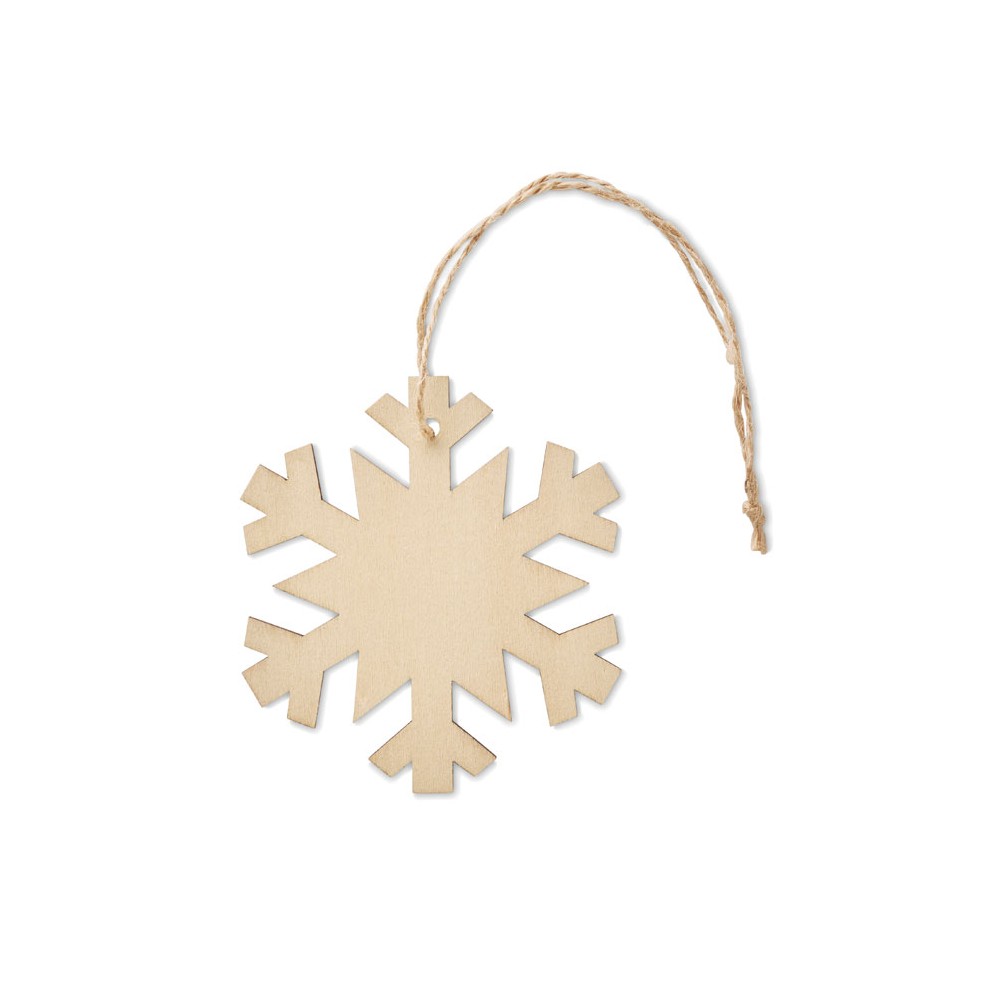 Fából készült hópehely alakú karácsonyfadísz, juta zsinórral.