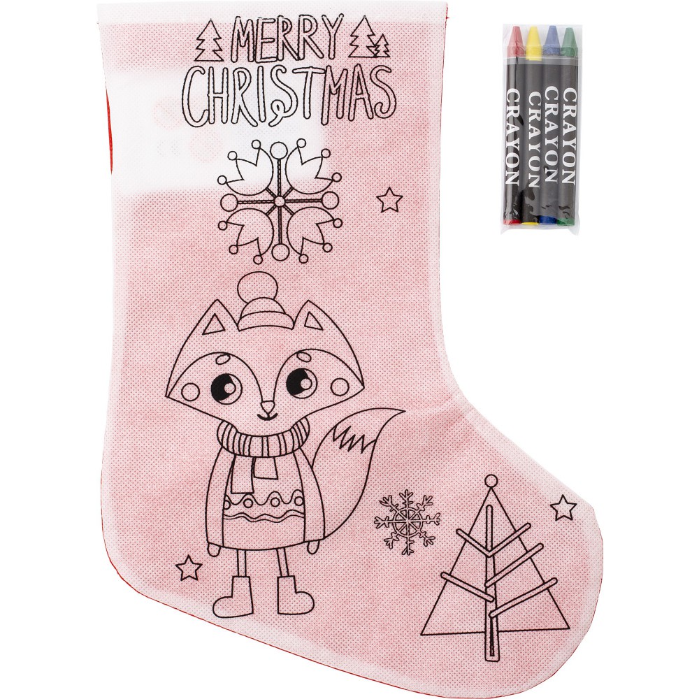Színezhető mikuláscsizma 4 db zsírkrétával (zöld, piros, sárga, kék színben). Egyik oldala piros, a másikon előre nyomtatott, színezhető mintával. Nemszőtt anyag, 80 g/m2.
