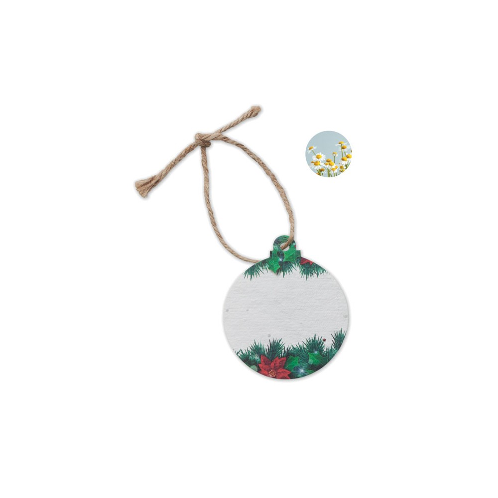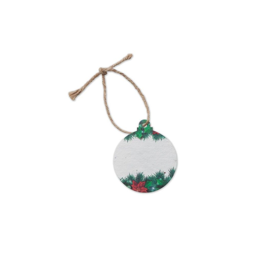 Karácsonyi gömbdíszt formázó, magpapír függődísz, vadvirág magkeverékkel, juta zsinórral. Használat után elültetve a magvakból vadvirágok hajtanak ki. EU-ban gyártva. Díszítse fel karácsonyfáját vagy otthonát ezzel a papírdísszel. Az ünnepek után a díszt elültetve vadvirágok keverékét termesztheti kertjében vagy erkélyén. Egy igazán fenntartható és újrahasznosított tárgy!