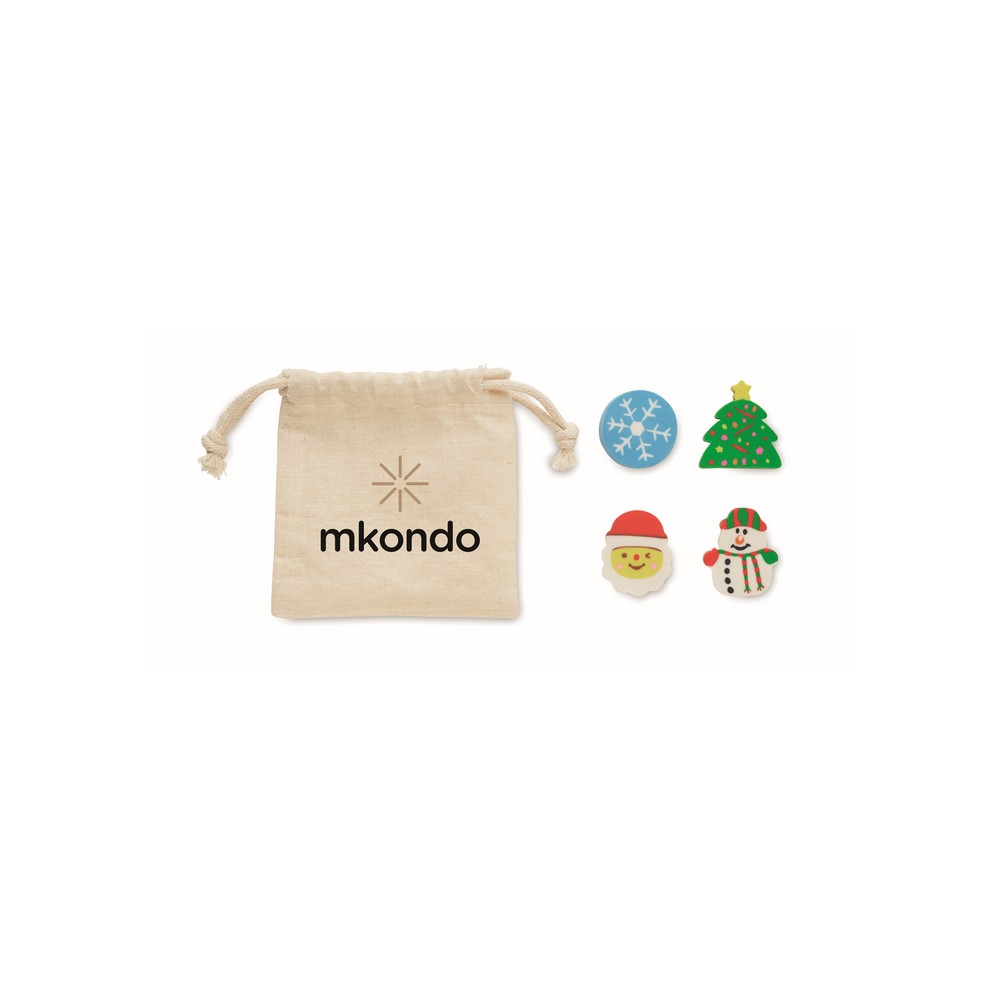 4 darab radír különböző karácsonyi (hópehely, Mikulás, karácsonyfa és hóember) motívumokkal. Pamut húzózsinóros tasakban.
