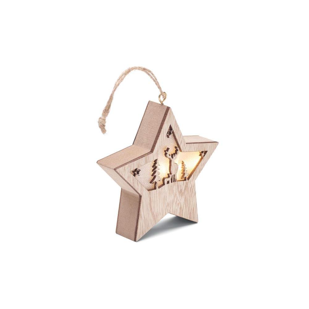 MDF karácsonyfadísz világítással, karácsonyi motívummal, akasztózsinórral. A működéshez szükséges 3 db LR44 elemmel szállítjuk.