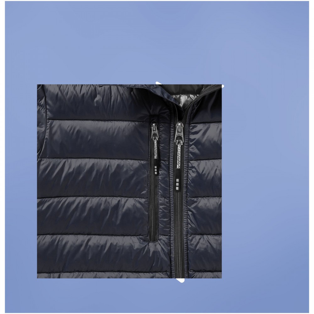 Normál szabásvonal. Pehelybiztos anyag. Cipzáros mell- és oldalzsebek. Emblémázásra alkalmas, cipzáros karzseb. Gumis szegély az aljon és a karöltőben. Könnyen megfogható cipzárhúzókák . Szél elleni állvédő betét a nyaknál. Vízlepergető, lélegző és szélálló. Hátul fényvisszaverő logónyomat . Könnyű, szigetelt pehelydzseki. 100% nylon, szőtt anyag, dupla vízlepergető bevonat, 20D. 80% pehely és 20% toll töltet. 115 g/m2