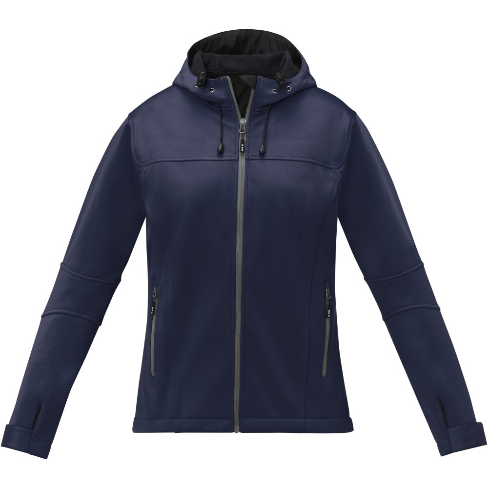Női softshell dzseki. 3000 mm vízálló és 3000 g/m2 légáteresztő. Háromrétegű ragasztás: Jersey, TPU, polár. Elasztikus húzózsinór megállítóval. Állítható mandzsetta tépőzárral. Elülső zsebek cipzárral. Ujjzseb cipzárral. Középen elöl kontrasztos fordított cipzár. Single Jersey kötött 90% poliészterből és 10% elasztánból, 360 g/m2, mikropolár 100% poliészterből.