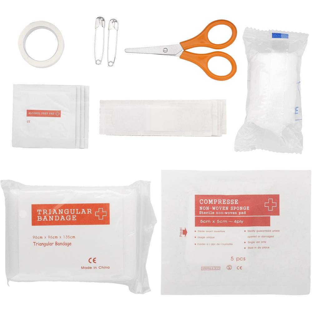 16 db-os készlet. Az EVA tasakban 4 alkoholos párna, 1 préselt szivacs, 5 ragtapasz, 1 papírtapasz, 1 kötszer, olló, 2 tű és 1 háromszög kötszer. EN13485 szabványnak megfelelő.