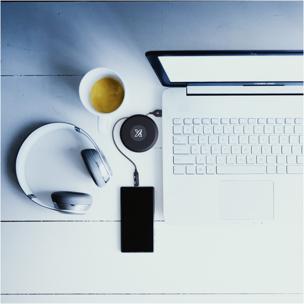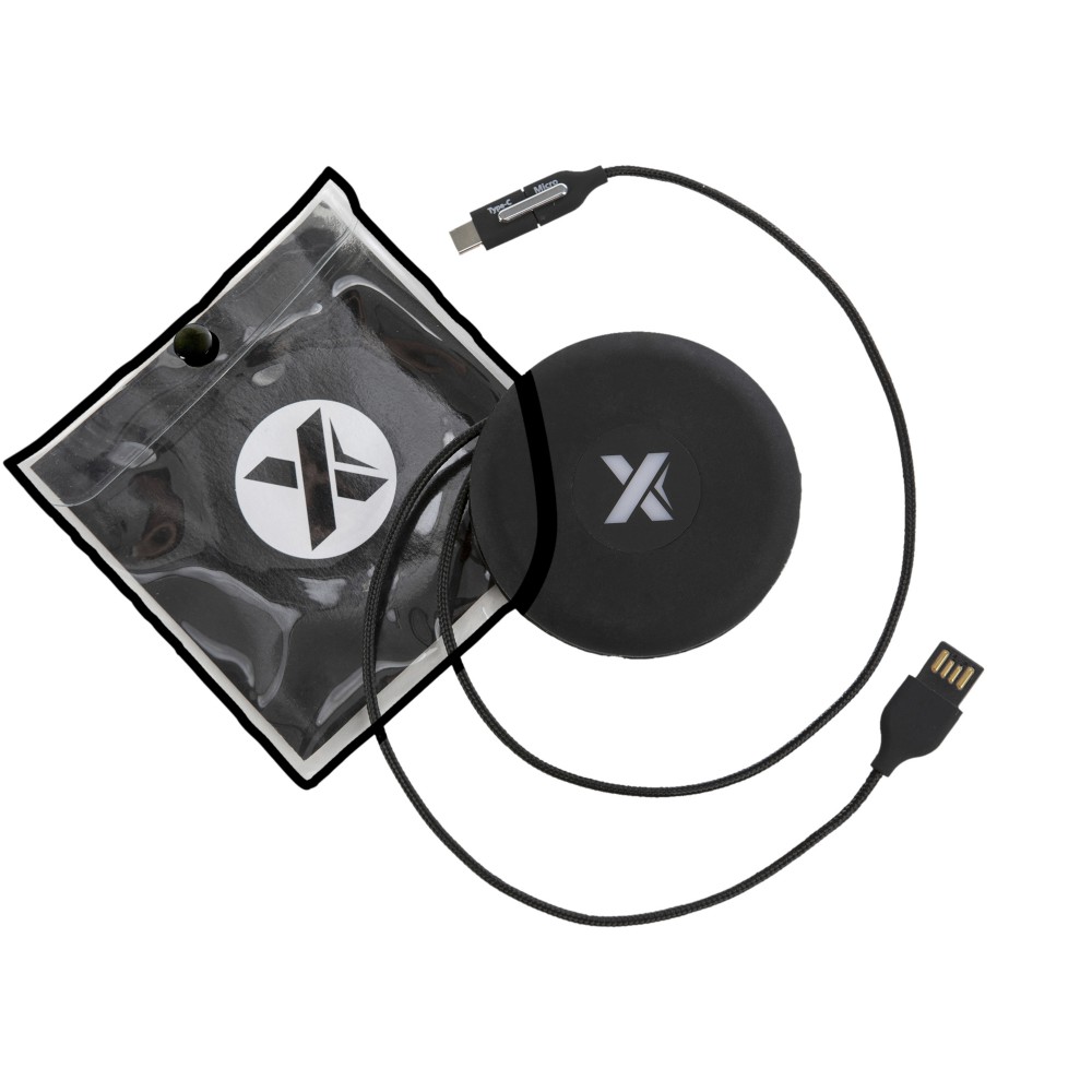 Világító logóval ellátott töltőkábel három csatlakozóval (C típusú, Android, iPhone). Szilikon tárolótasakja van, így tökéletes útközbeni kiegészítő. A csomagolás újrahasznosított papírból és újrahasznosított műanyagból készül. ABS műanyag, újrahasznosított PET műanyag.