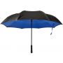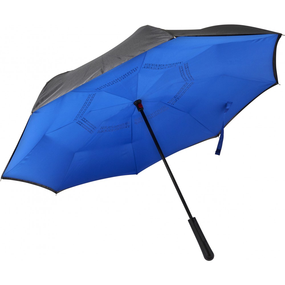 Innovatív, kiforduló szerkezetű, duplafalú esernyő, üvegszálas vázzal és műanyag fogóval. Tépőzáras.