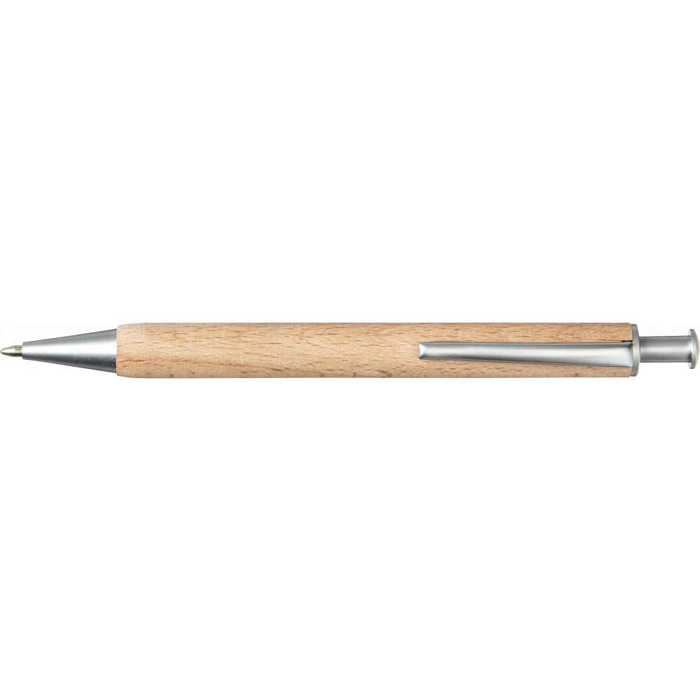Bükkfa golyóstoll fém kiegészítőkkel, kék tollbetéttel.