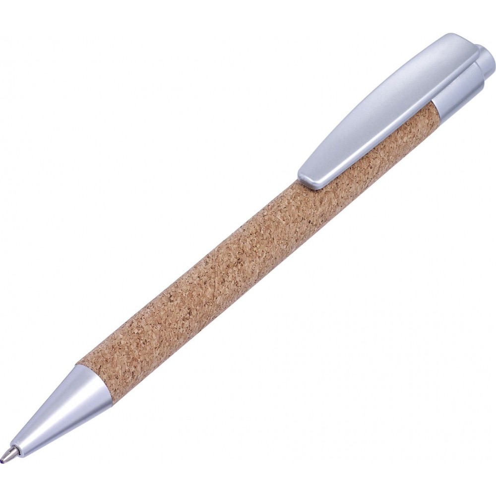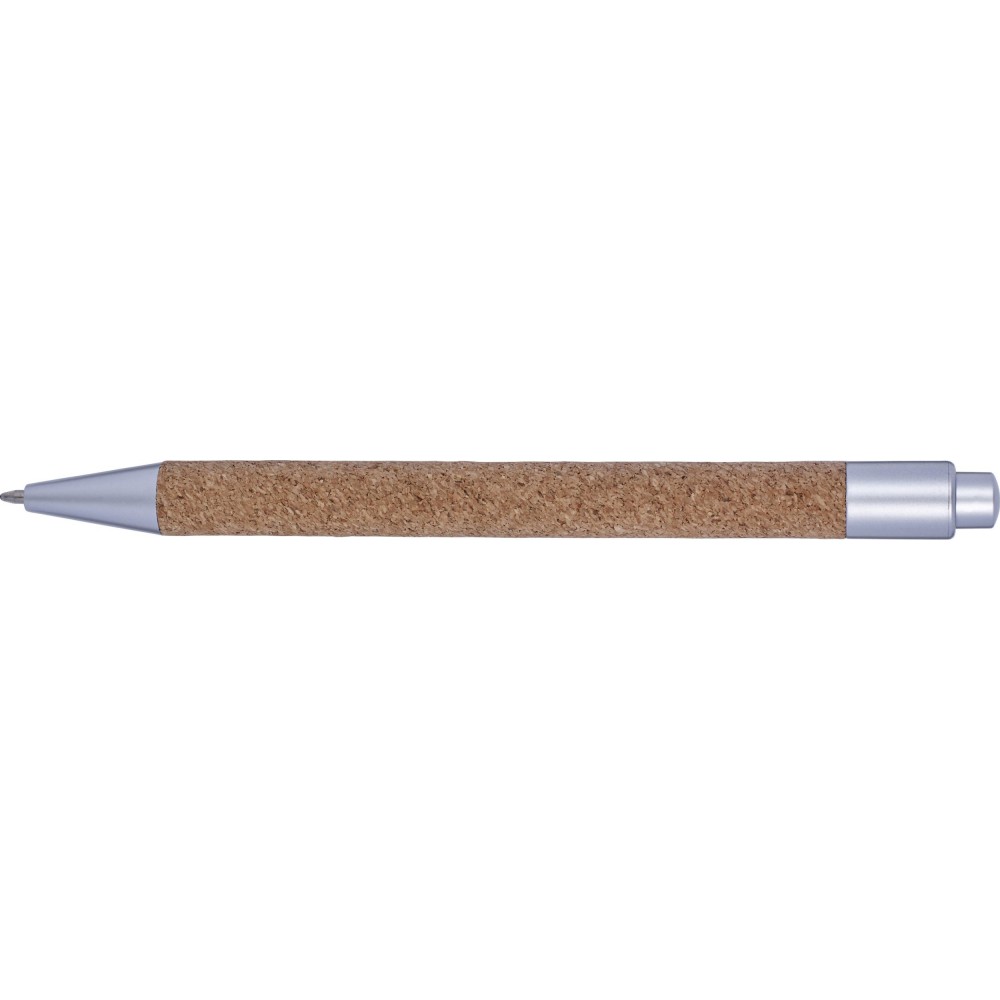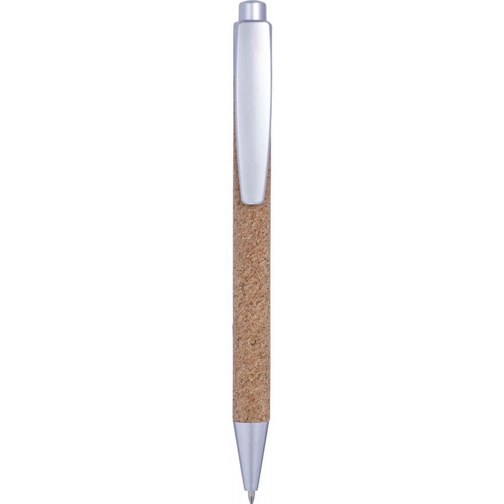 Golyóstoll parafa tolltesttel és műanyag véggel, klipsszel és nyomógombbal. Kék tollbetéttel. ABS, parafa.