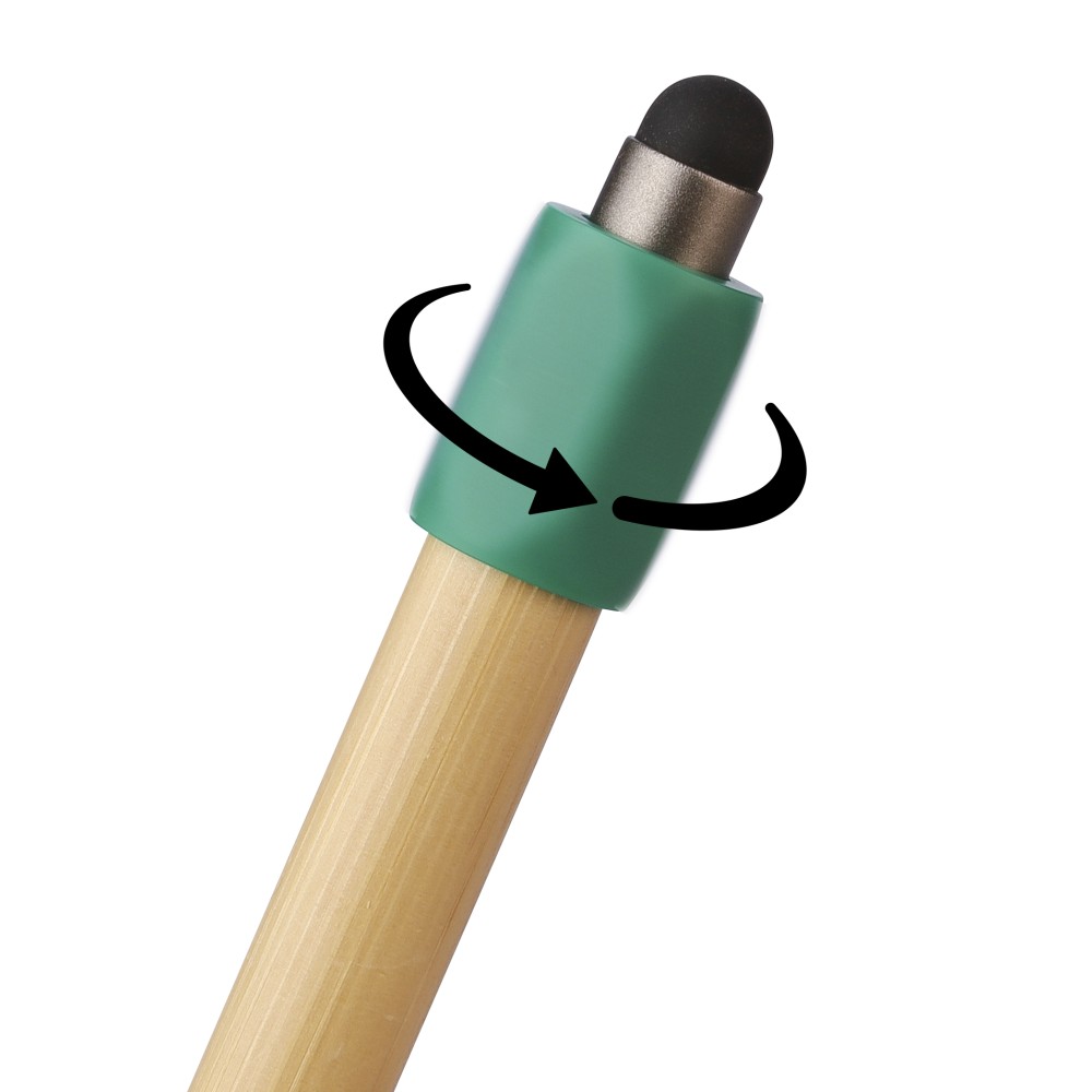 Bambusz golyóstoll újrahasznosított ABS pörgettyűvel és fekete érintővel a nyombógombon. A tollhegy vastagsága 1.0 mm, íráshossz: kb. 800 méter. Az újrahasznosított anyagra utaló logó a tollra van gravírozva.