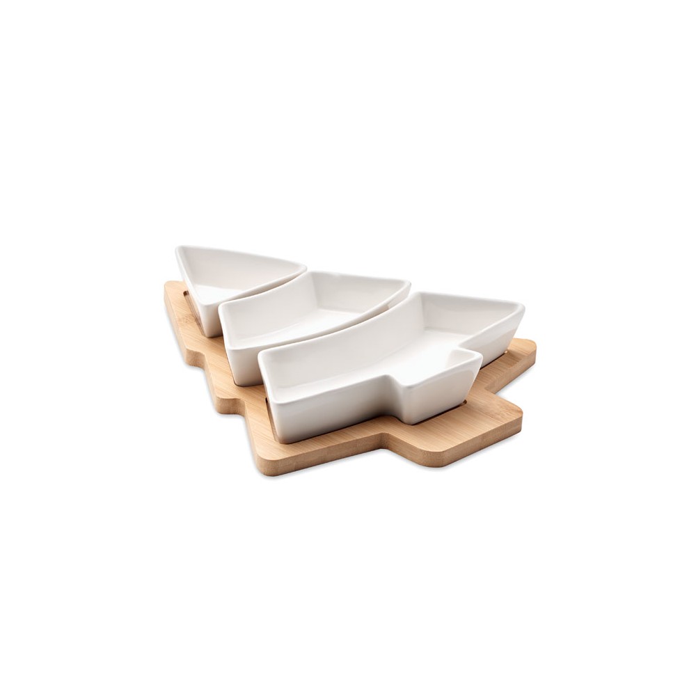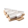 Karácsonyfa alakú bambusz tálalótál három kerámia tálalóedénnyel. A bambusz természetes anyag, színében, mintázatában és méretében esetenként eltérő lehet.