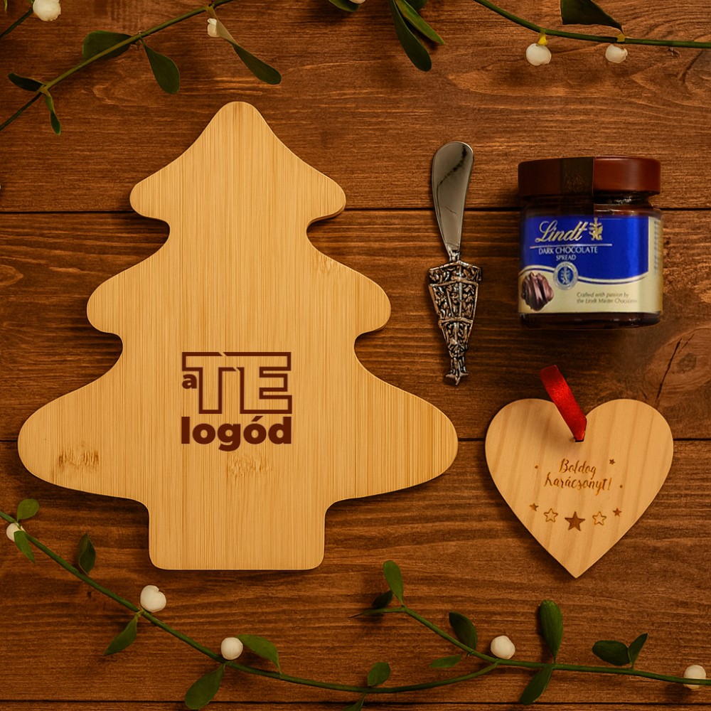 Ünnepi ajándékcsomag, amely gondosan válogatott kiegészítőkkel és finomságokkal teszi emlékezetessé a karácsonyt. A csomag tartalma: karácsonyfa alakú vágódeszka fenyő alakú kenőkéssel (CX1477-40), Lindt dark chocolate krém, 200 g (G20458), szív alakú karácsonyfadísz (9050-11). Csomagolási lehetőségekről érdeklődj ügyfélmenedzserednél! A kép illusztráció. A kínálatunkban szereplő termékek igény szerint kombinálhatók. A csomagot rendelés esetén állítjuk össze. Várható szállítási határidő: kb. 2 hét. A termékek emblémázását és csomagolását nem tartalmazza a csomag ára. A csomagban szereplő élelmiszer csak csomag részeként rendelhető.