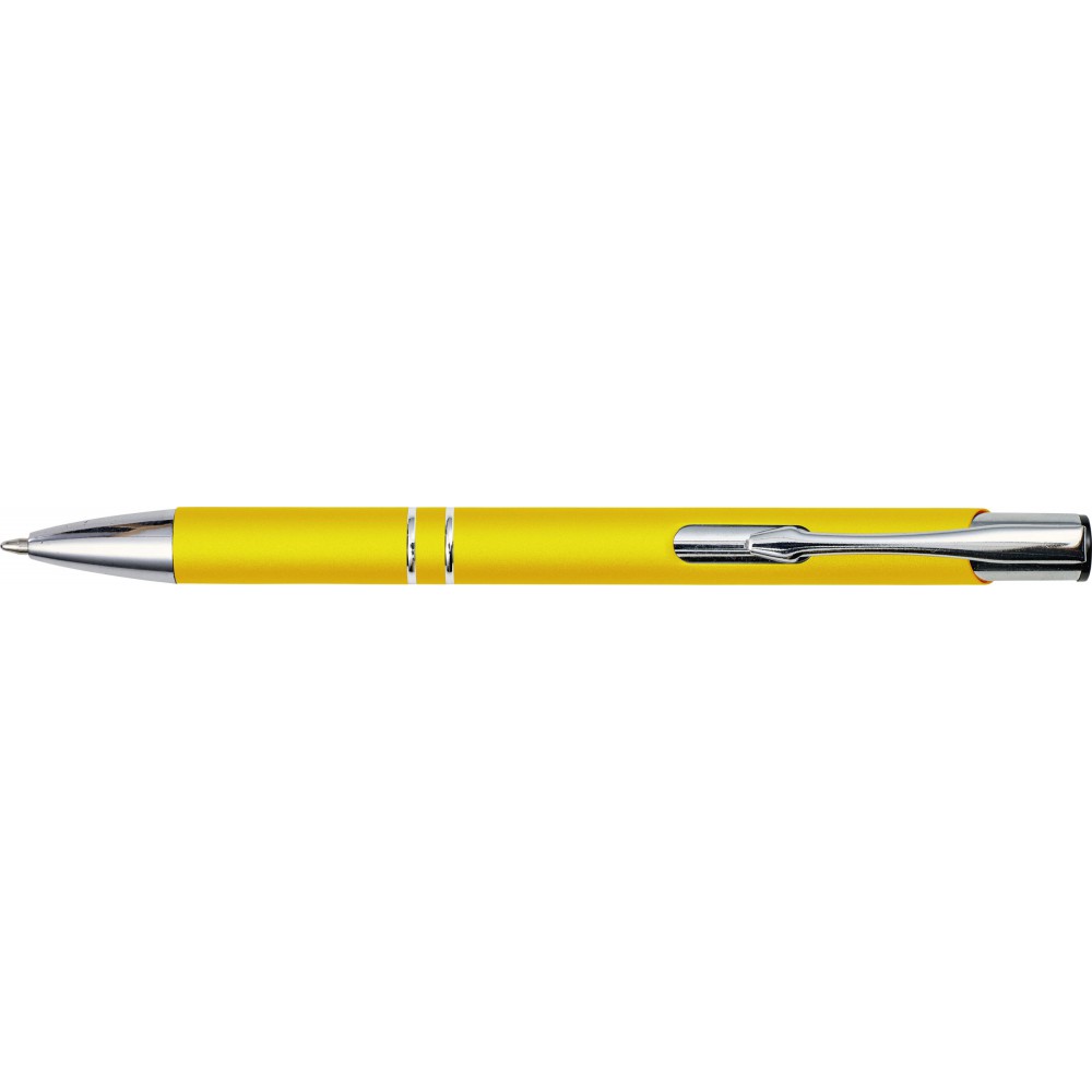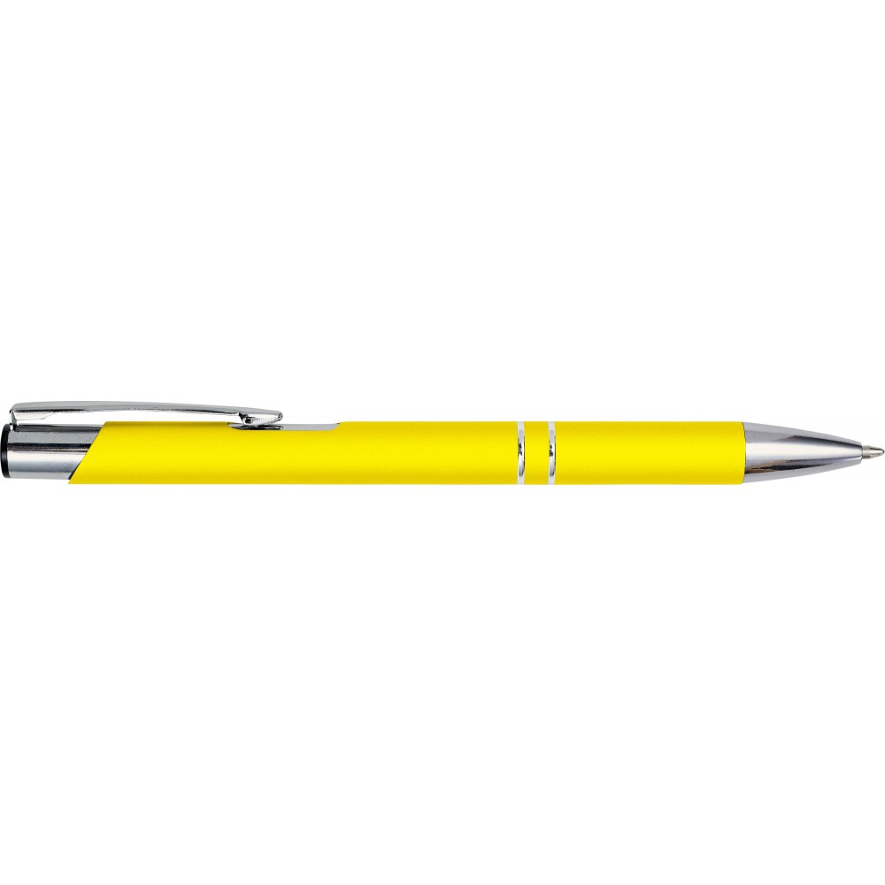 Golyóstoll gumis felülettel, krómozott kiegészítőkkel, kék tollbetéttel. Fém.