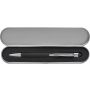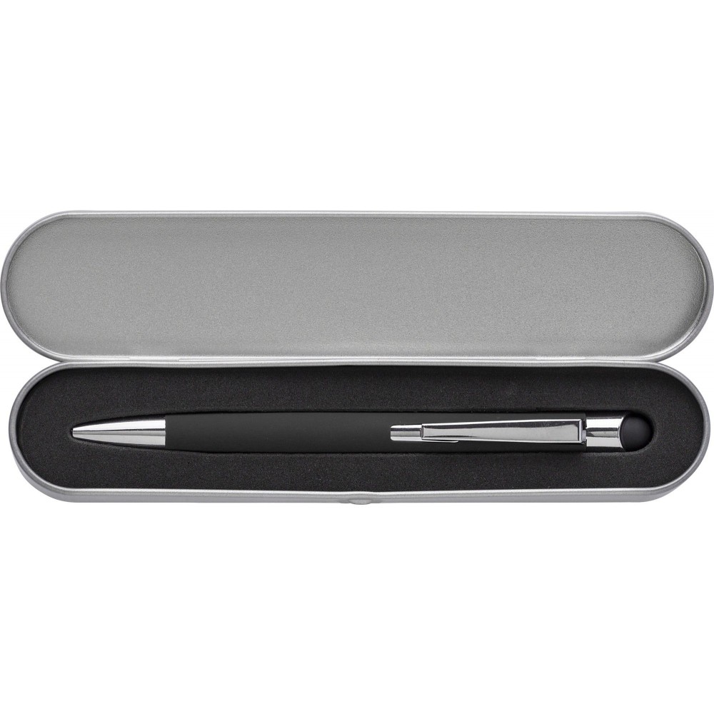 Golyóstoll gumis bevonattal, érintővel, fekete tollbetéttel. Csomagolása fém tolldoboz. Alumínium.