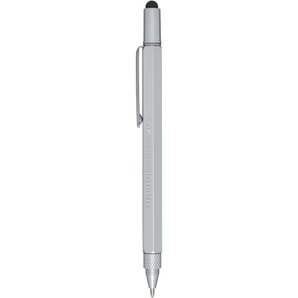 A Dora alumínium multifunkciós golyóstoll részben újrahasznosított anyagokból készült, és tartalmaz kétoldalas vonalzót, csavarhúzót, vízmértéket, valamint egy fekete gumiból készült érintőt. A tollteste újrahasznosított alumíniumból készült, ezüst spray bevonattal. A klipsz vasból, a csavarhúzó acélból, a felső rész és a hegy pedig újrahasznosított ABS anyagból készült. Fekete tollbetéttel. Írási hossz: 400 méter. Tollhegy mérete: 1,0 mm.