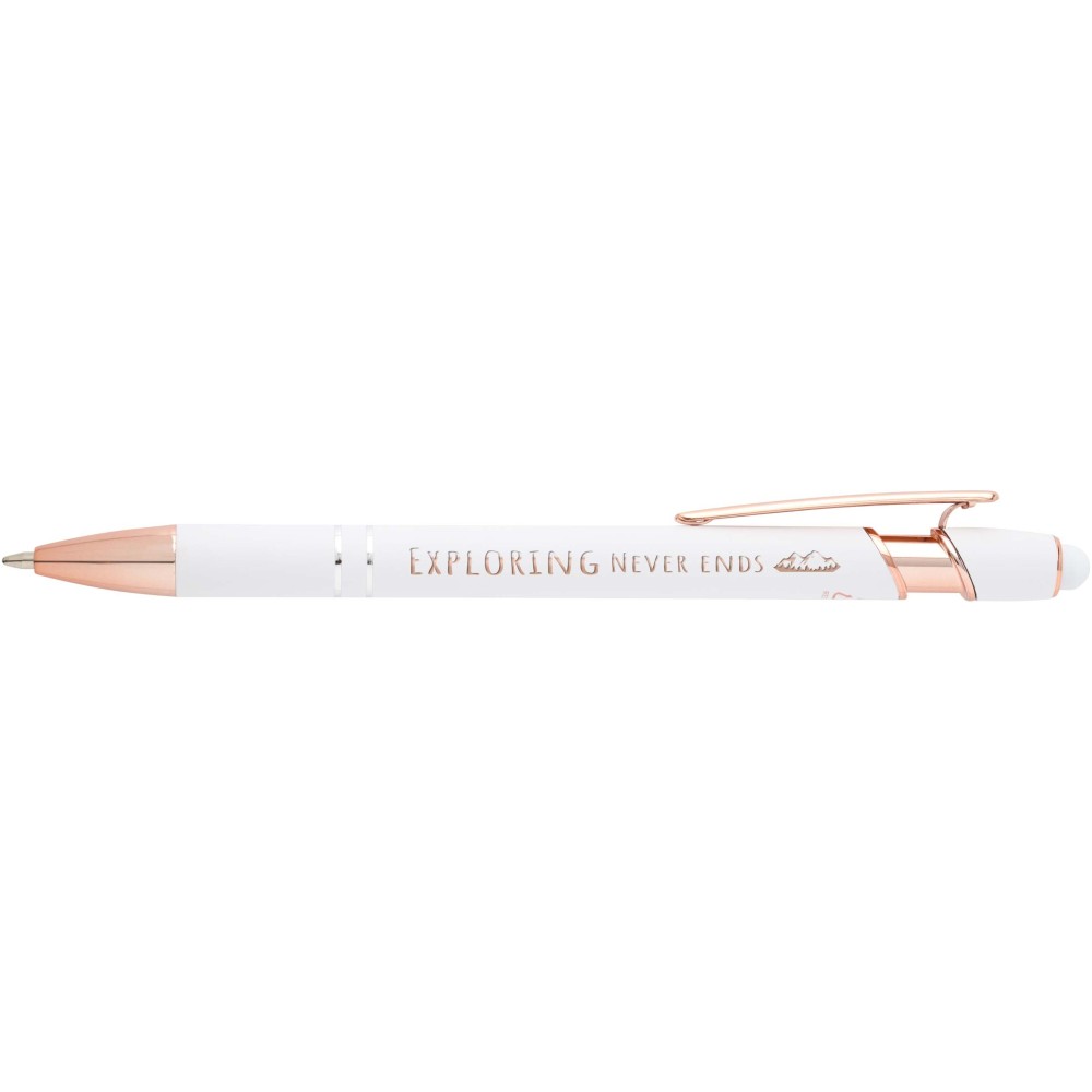 Nanna golyóstoll elegáns rózsaarany színben. A toll teste újrahasznosított alumíniumból, az érintőceruza pedig szilikonból készült, így érintőképernyős eszközökhöz is használható. Az újrahasznosított alumínium csökkenti a hulladéklerakók terhelését, segít megőrizni a természeti erőforrásokat, és célja az üvegházhatású gázok kibocsátásának mérséklése. Tinta színe: kék. Íráshossz: 800 méter. Tollhegy mérete: 1,0 mm.