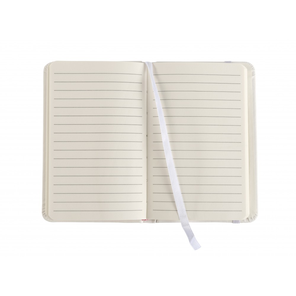 Puha PU borítású A6-os jegyzetfüzet 96 vonalas lappal, jelölőszalaggal és gumipánttal.