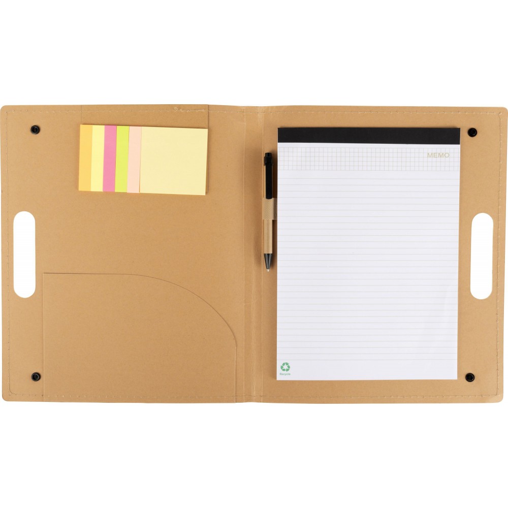 Karton mappa tartalma: 20 lapos jegyzettömb (kb. A4), egy karton toll fekete tintával és öntapadó jelölők 4 színben, 25 lappal színenként. 70 g, 600 g papír.