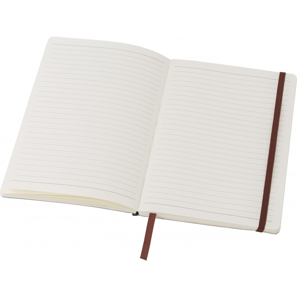 Puhafedelű, hajlékony borítójú füzet 80 vonalas lappal, a borító belsejében zsebbel, gumis záródással és könyvjelzővel. PU.