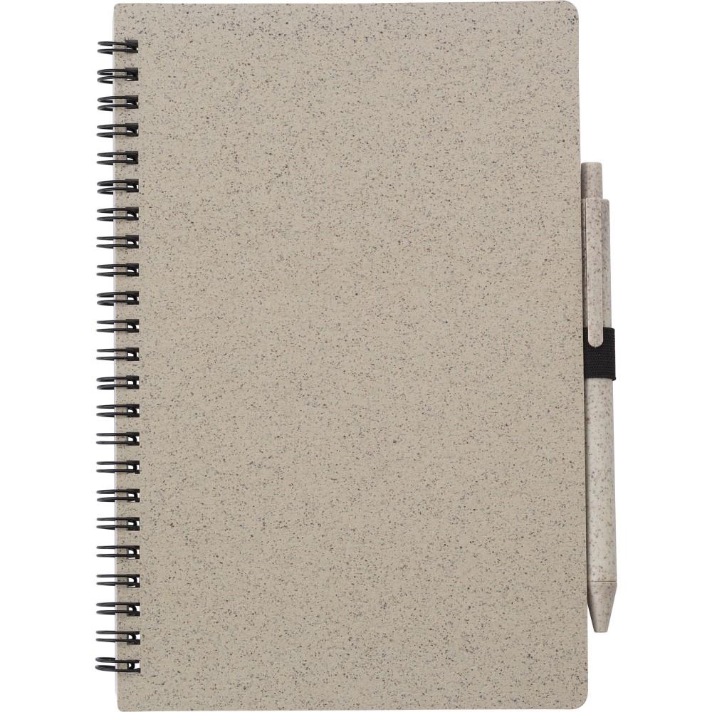 Szalma és PP műanyag felhasználásával készült füzet és golyóstoll (kék tollbetéttel). 70 vonalas lap. Kb. A5-ös méret.