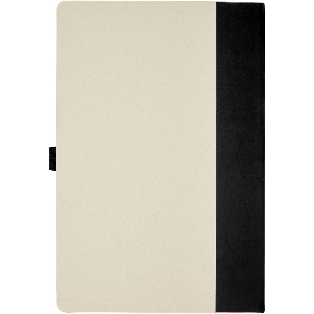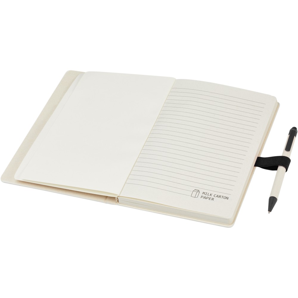 A5 méretű füzet és golyóstoll készlet. A jegyzetfüzet 80 vonalas lapot (80 g/m2) tartalmaz, amelyek újrahasznosított tejes kartondobozokból készülnek (akár 70%), színes papírgerinccel és egy tollhurokkal. A tollhurokban egy nyomógombos golyóstoll található a jegyzetfüzet színéhez illő színben. A toll teste ugyanabból az újrahasznosított anyagból készült, a gomb, a klipsz és a hegy pedig színes PLA műanyagból készült. A toll fekete tollbetéttel érkezik. A használt tejesdobozokat összegyűjtik, válogatják, feldolgozzák és papírrá alakítják, így a hulladékból hasznos termék készül.