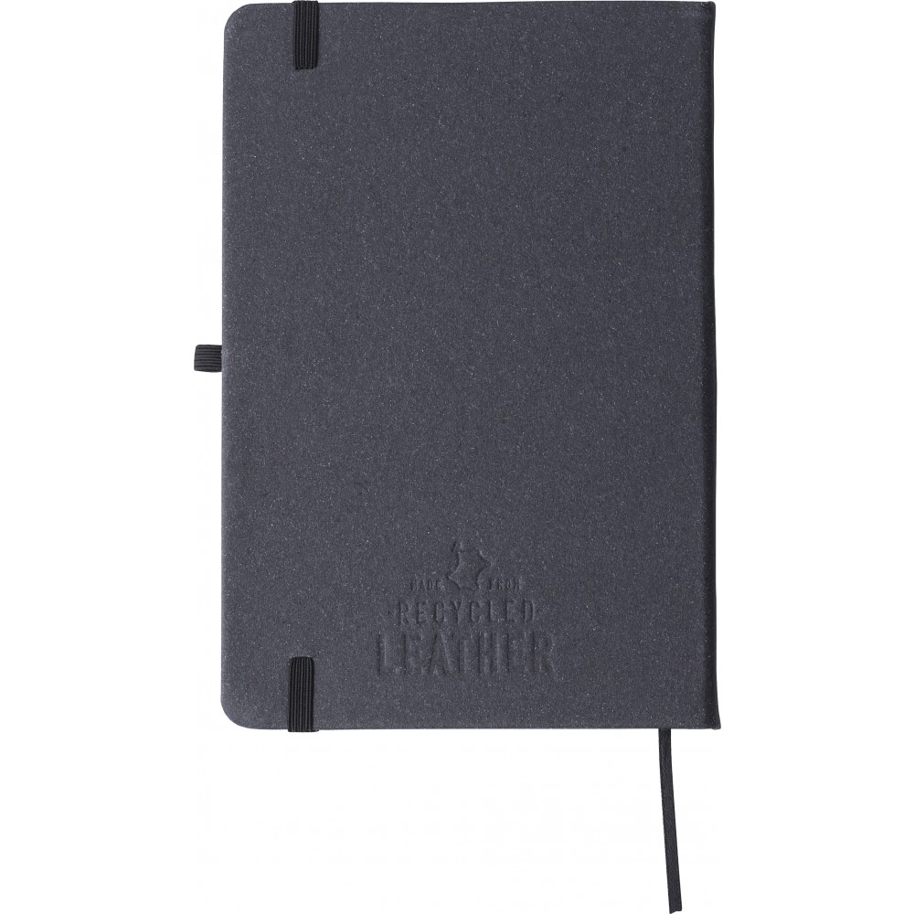 Újrahasznosított bőrből készült A5-ös jegyzetfüzet 100 vonalas lappal. Gumis záródás, tollhurok és könyvjelző szalag. Hátoldalán az újrahasznosított anyagra utaló logónyomat látható.