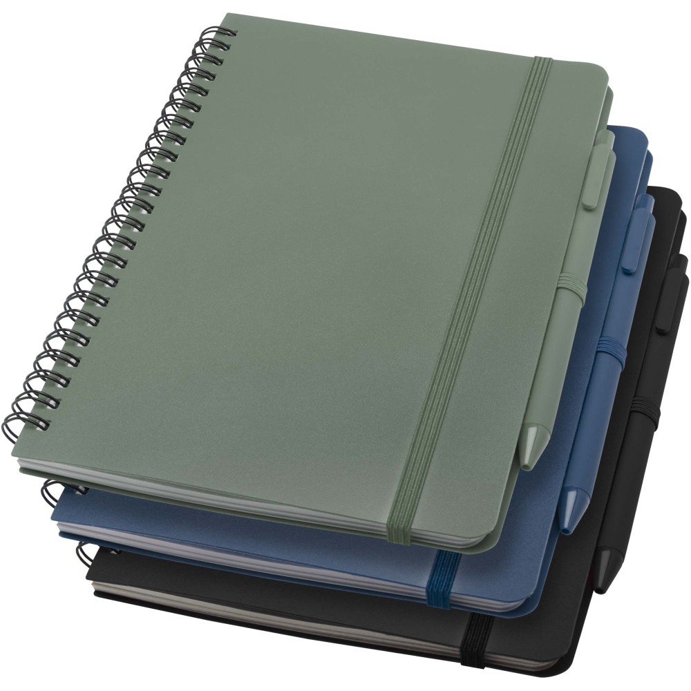 Thalaasa A5 keményfedeles jegyzetfüzet óceánból származó újrahasznosított műanyagból készült, és 80 vonalas, 70 g/m2 krémszínű lapot tartalmaz. A jegyzetfüzet lekerekített sarkokkal, elasztikus zárással és tolltartóval rendelkezik. A fekete tintával író golyóstoll szintén óceánból származó újrahasznosított műanyagból készült. Íráshossz: 1000 méter. Tollhegy mérete: 1,0 mm.