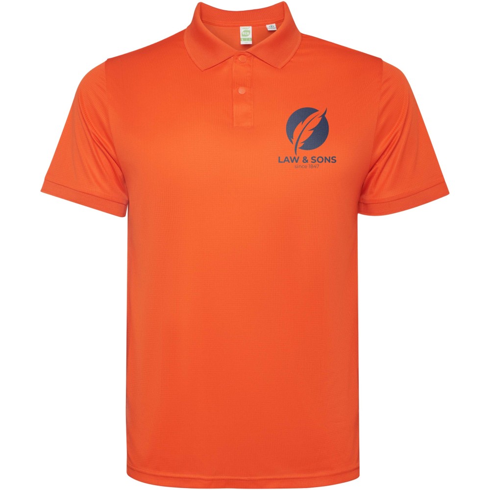 Rövidujjú galléros póló. Erősített, fedett varrások a belső gallérban. 1x1 bordázott kézelő és gallér. Oldalsó varrások. 3 gombos nyakrész és oldalsliccek. 100% újrahasznosított poliészter interlock kötésű anyag, 120g/m2.