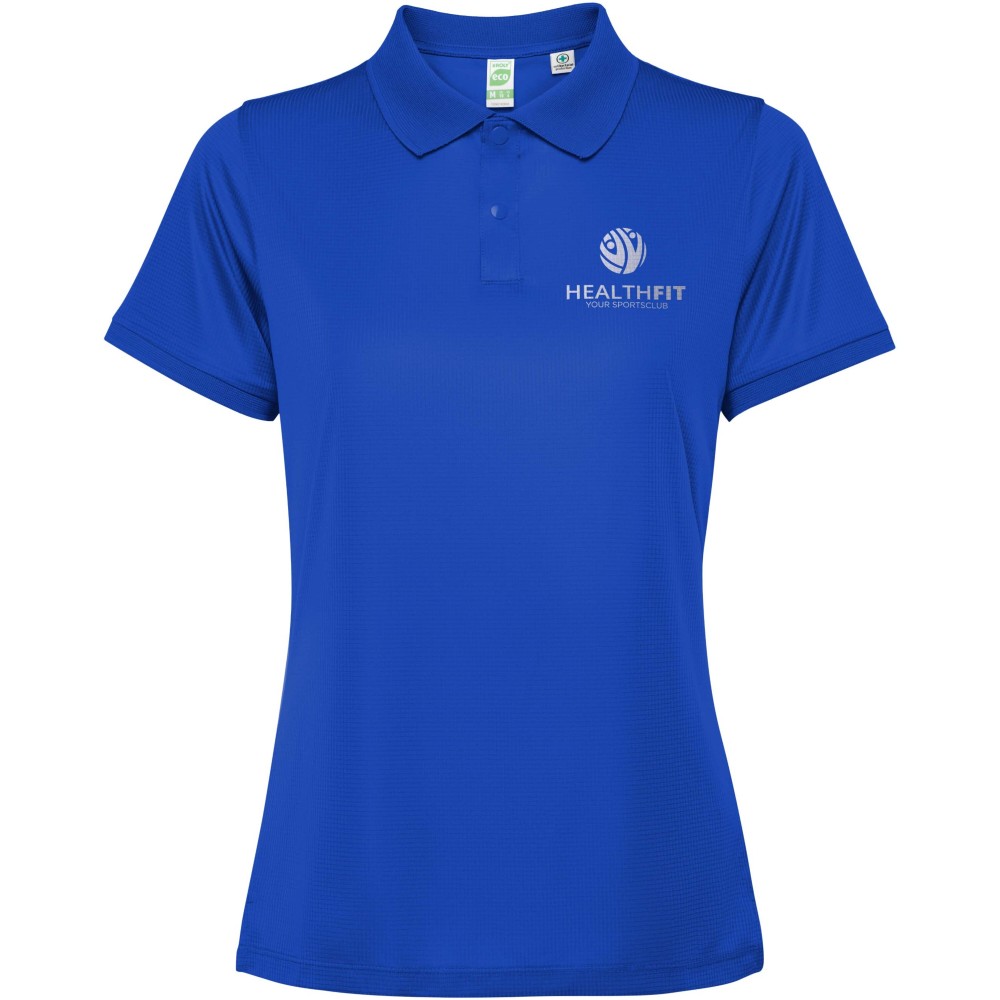 Rövidujjú galléros női póló. Erősített, fedett varrások a belső gallérban. 1x1 bordázott kézelő és gallér. Oldalsó varrások. 3 gombos nyakrész és oldalsliccek. 120g/m2.