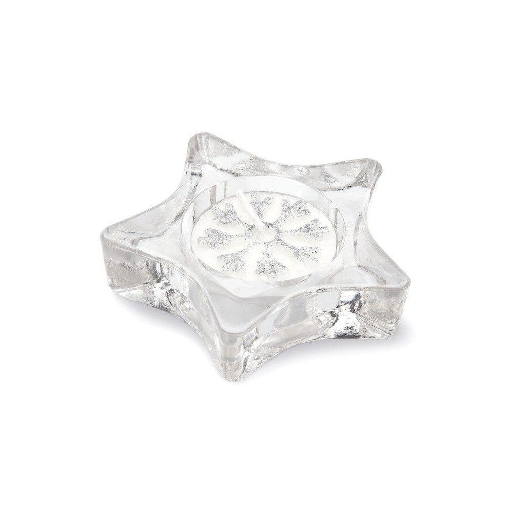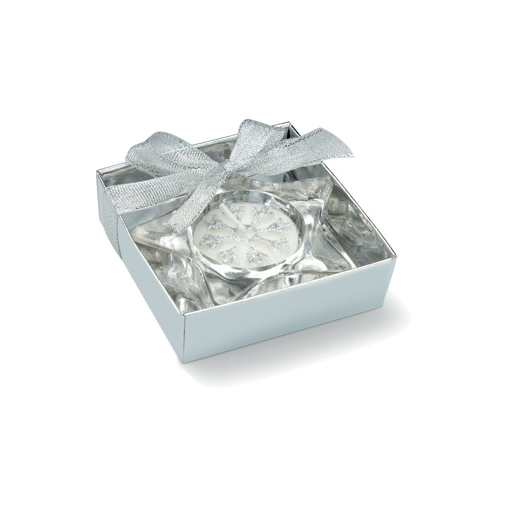 Csillag alakú üveg gyertyatartó. Átlátszó fedelű ezüst színű ajándékdobozban, dekoratív szalaggal. Teamécsessel szállítjuk.