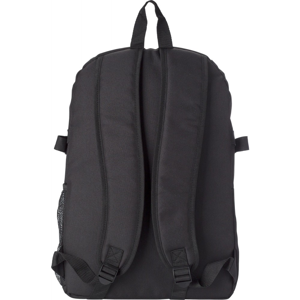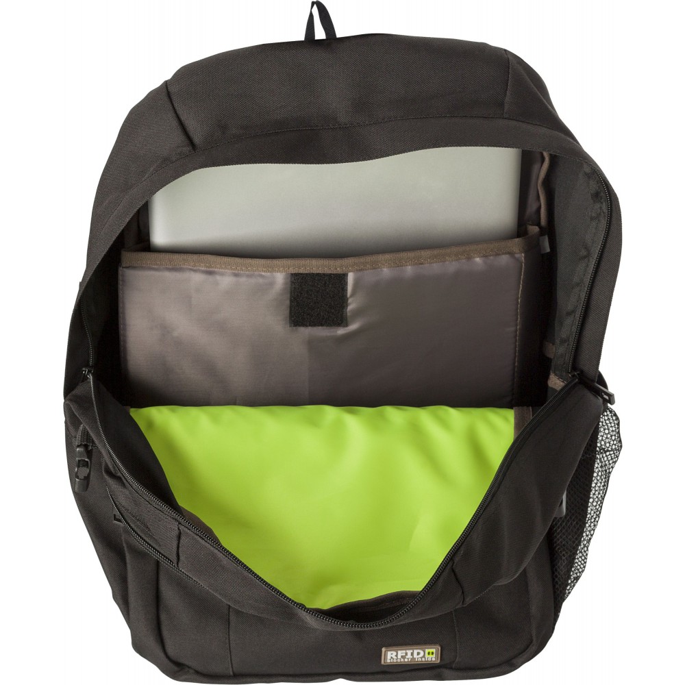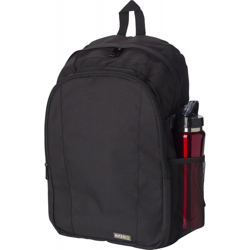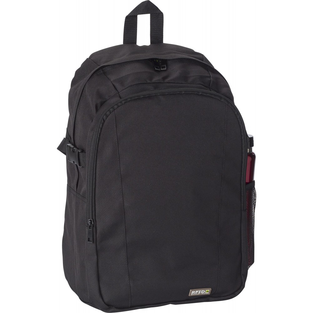 Hátizsák RFID blokkolóval. Az első zseb és a fő rekesz cipzáras. Belül több zseb biztosítja a kényelmes használhatóságot. Oldalhálós külső zseb. A pántok párnázottak és állíthatóak. 600D poliészter.
