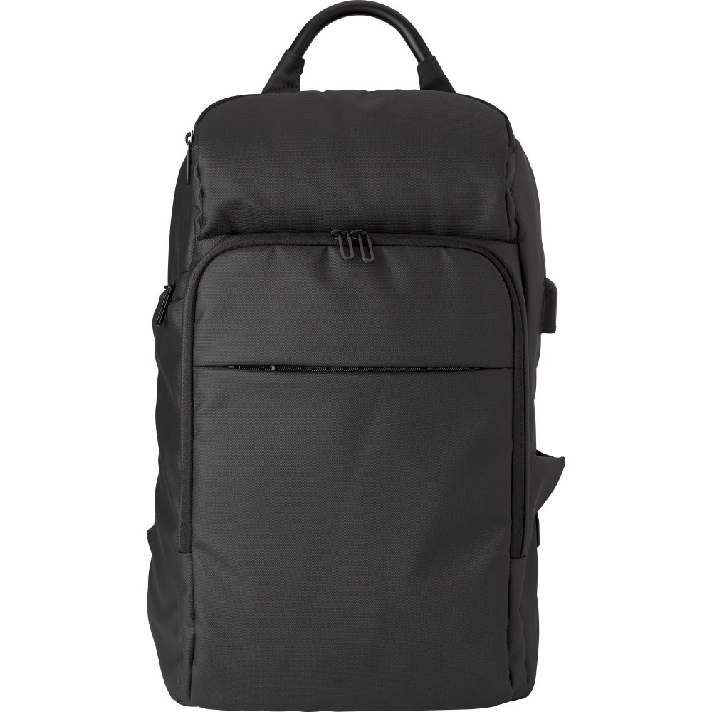 Hátizsák párnázott laptop rekesszel 15 -es laptop számára, USB porttal és vezetékkel, könnyített súlyelosztást biztosító kialakítással. Párnázott hátrész és állítható vállpánt, alumínium fóliával bélelt oldalzseb. 600D PU anyag.