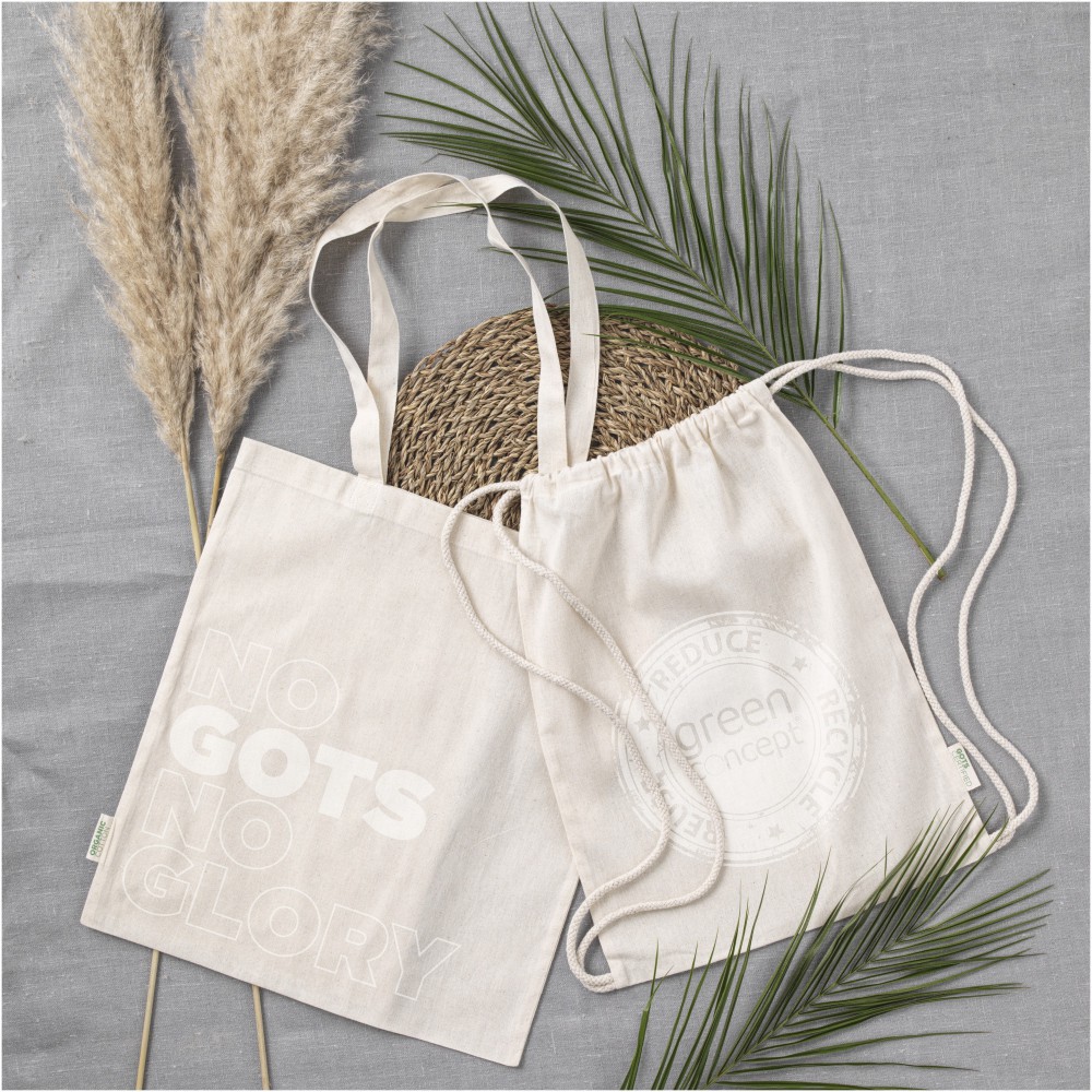 Fenntartható anyagból készült tornazsák egy nagy fő rekesszel és pamut zsinóros zárással. Minősített biopamut táska. Teherbírás 5 kg súlyig. Csak gyári emblémázással rendelhető az öko minősítések megtartása érdekében. Az emblémázásra kérje árajánlatunkat.