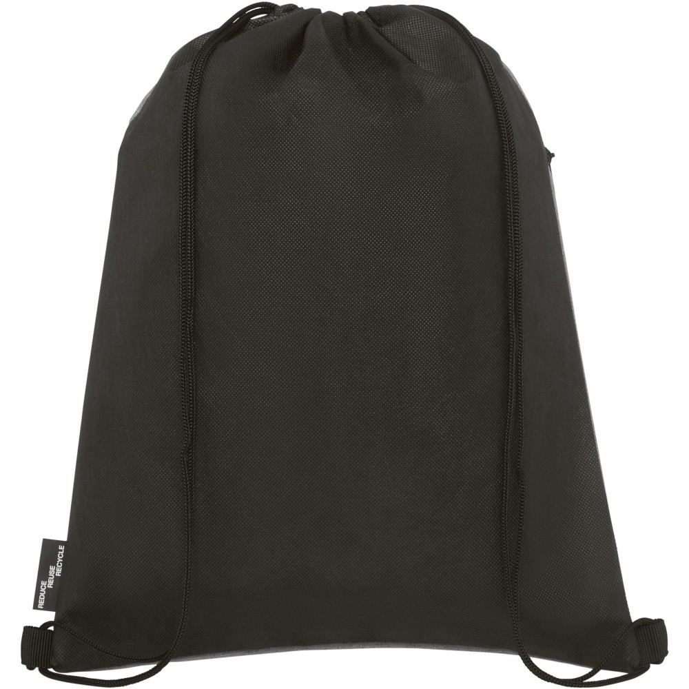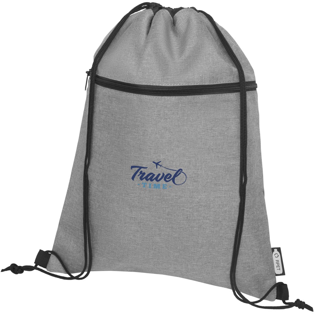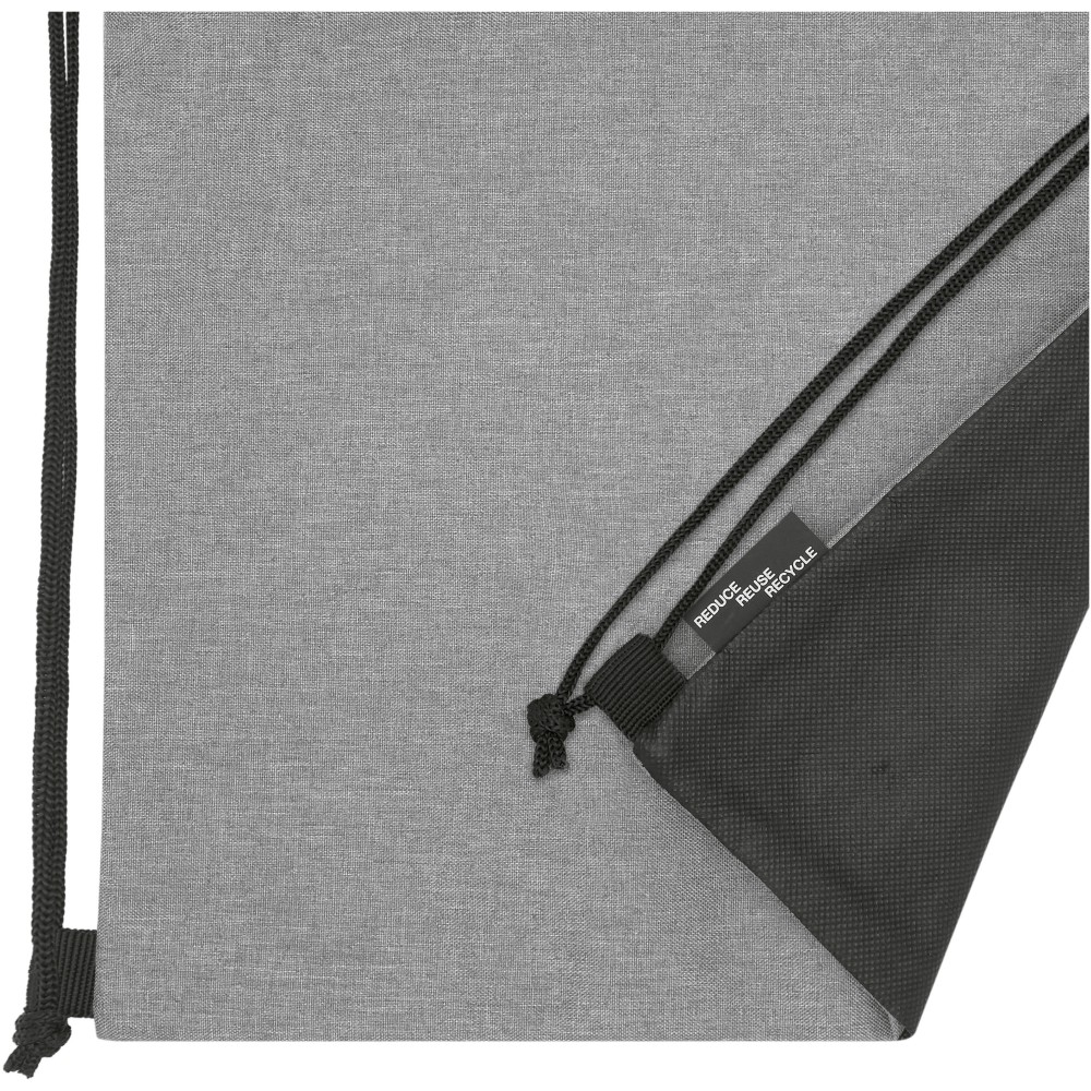 Tornazsák újrahasznosított RPET anyagból, fekete húzózsinórral, cipzáros zsebbel. Teherbírás 5 kg-ig. A termék színében kisebb eltérések lehetnek a festés, a szövés és a nyomtatás jellege miatt. 300D of újrahasznosított PET műanyag, újrahasznosított nemszőtt polipropilén, 80 g/m2.