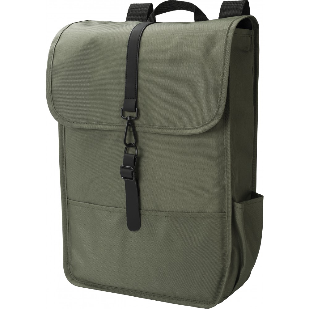 Hátizsák. Két palackzseb az oldalán, egy nagy rekesz. Fekete PU pánttal, csattal zárható. 300D RPET poliészter.