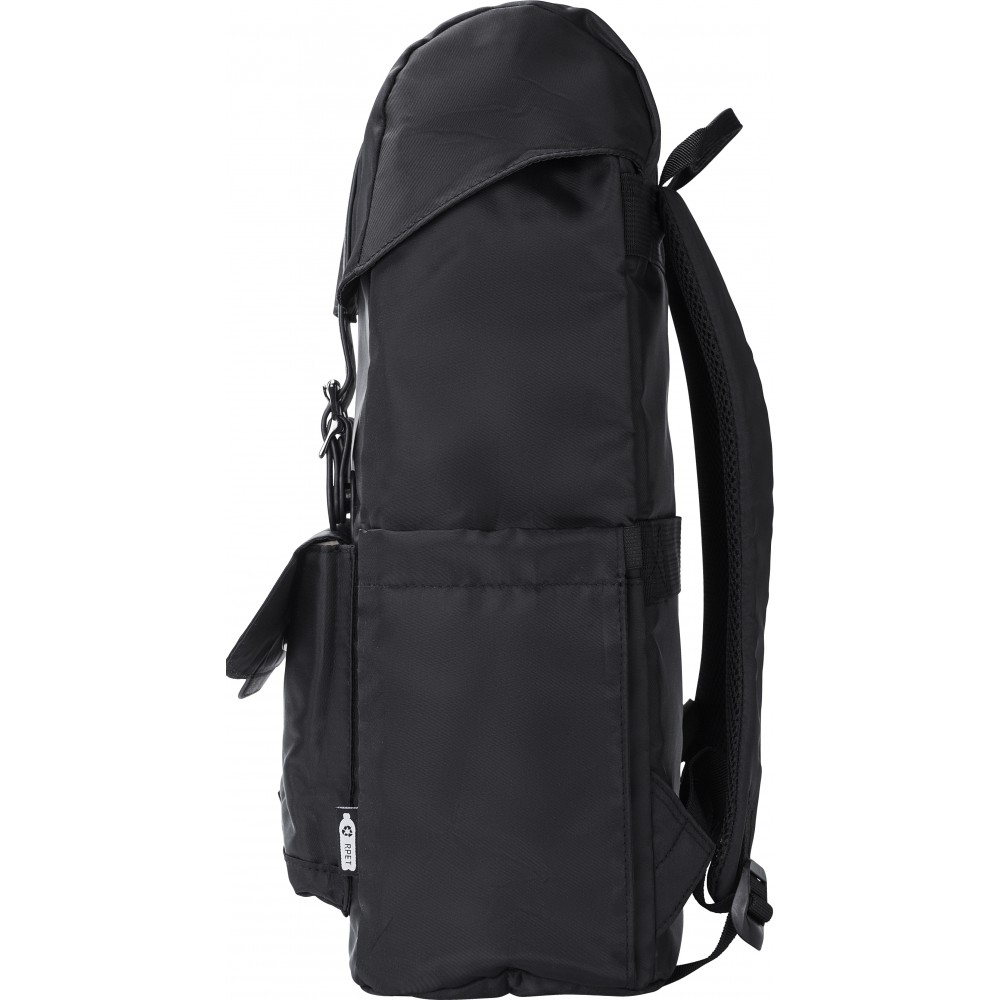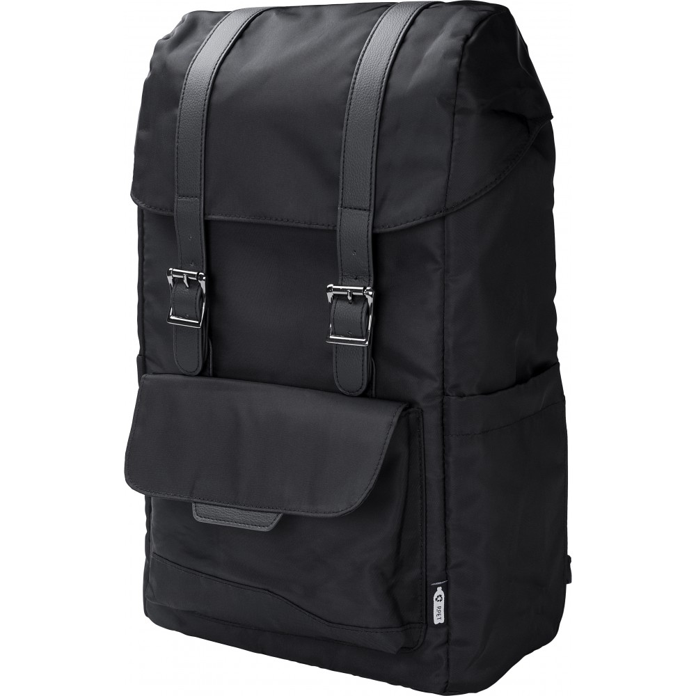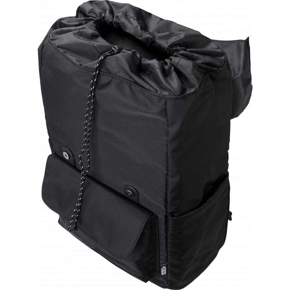 Hátizsák. Oldalt palacktartók, elöl mágneses záródású zseb. A belső zseb zsinórral zárható, belül laptoptartó és normál zseb található (15 -es laptop számára). A hátoldalon pánt található a bőrönd húzókájára való rögzítés érdekében. Vízlepergető bevonat. 290T twill poliészter RPET.
