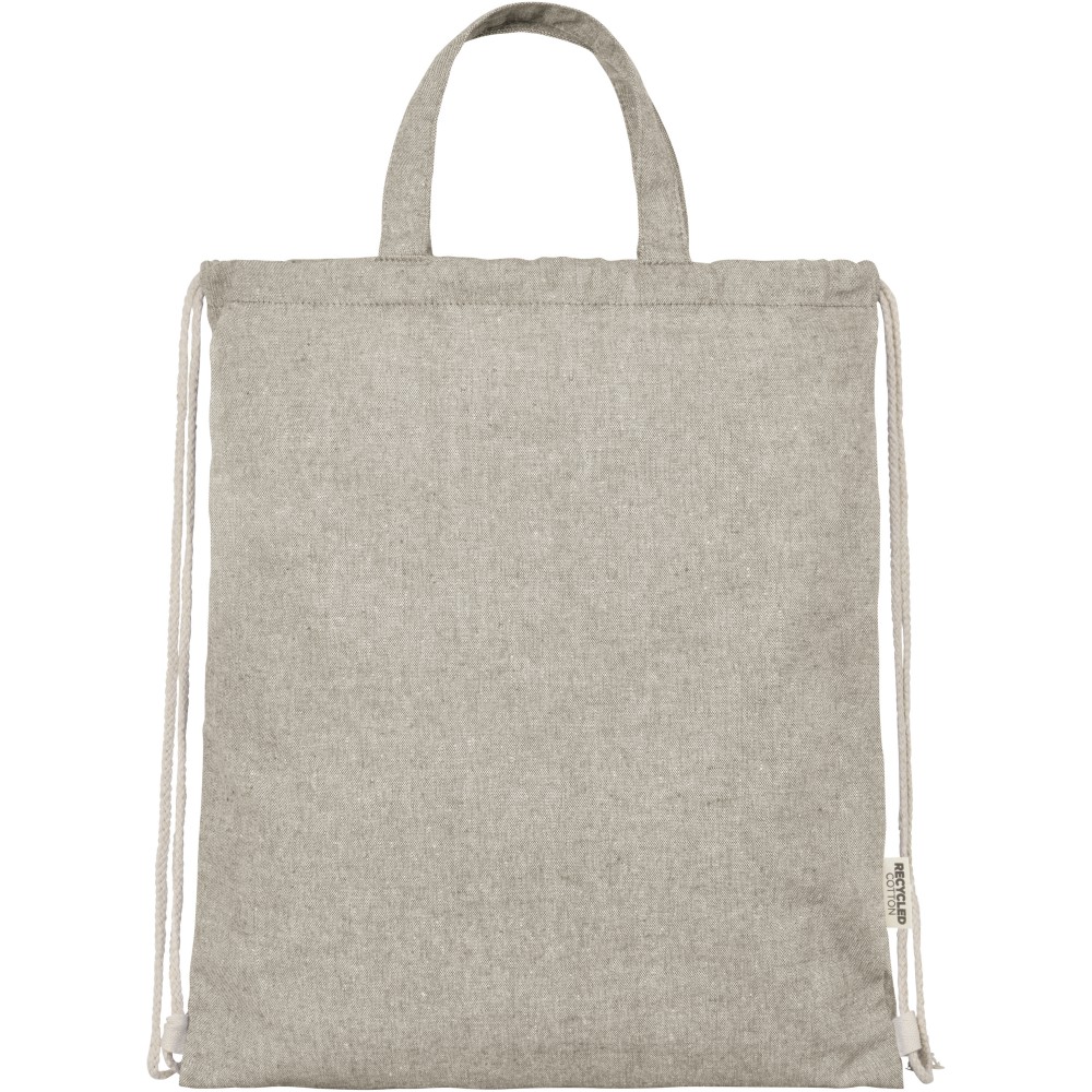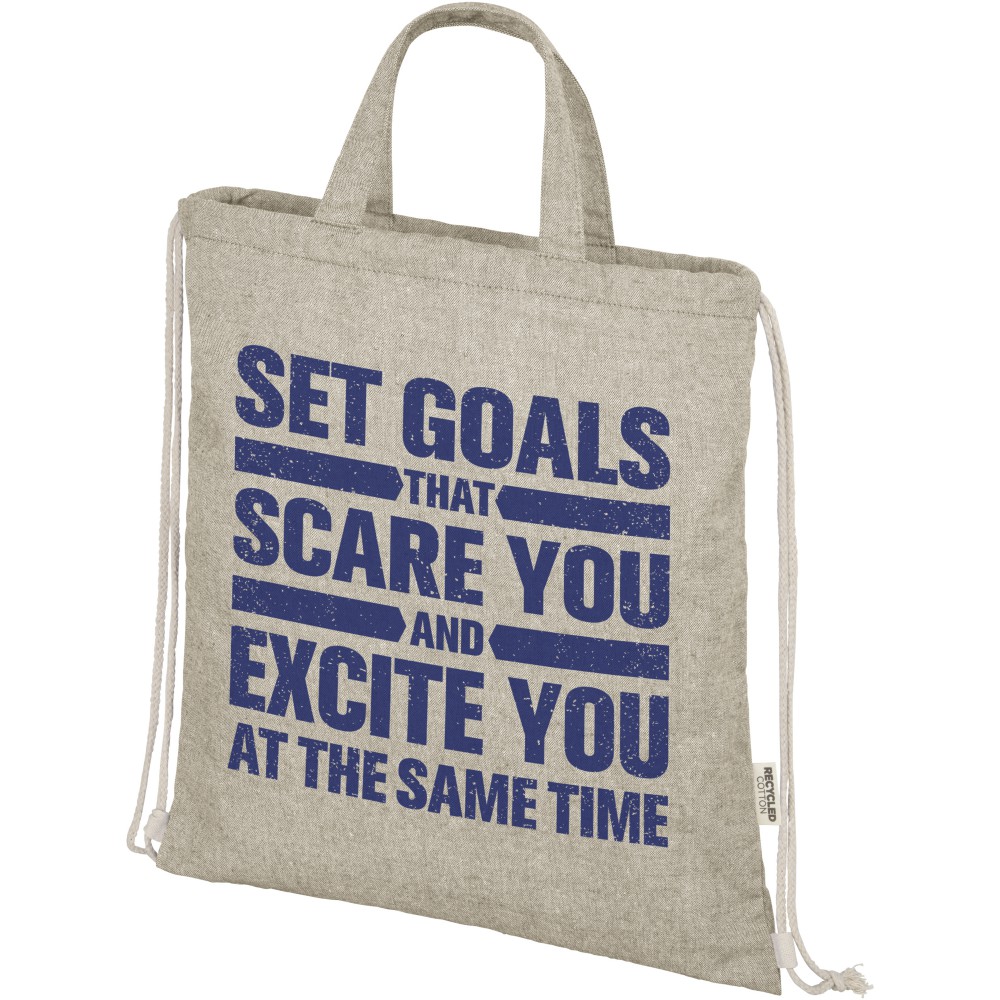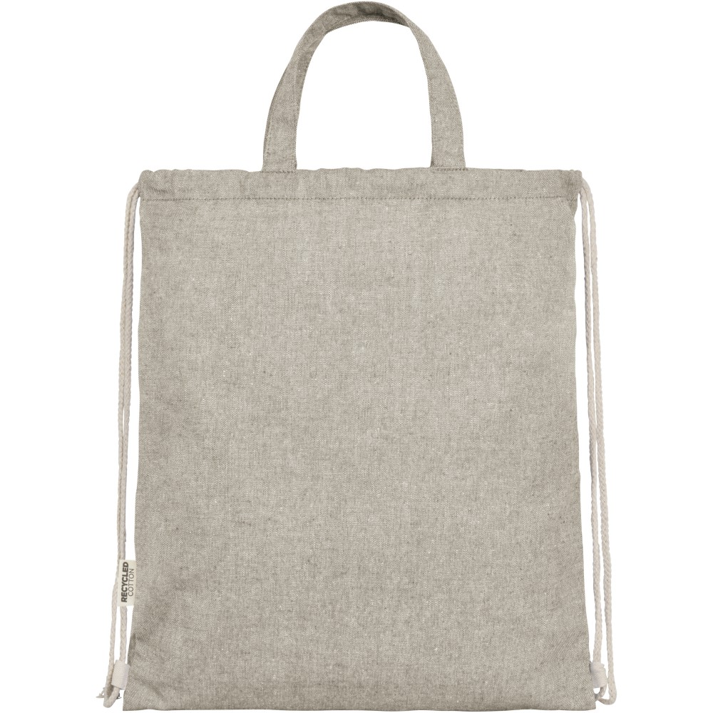 Zsinóros hátizsák 150 g/m2 súlyú újrahasznosított pamut-poliészter keverékből. Tágas, pamut zsinórral záródó, természetes színű fő rekesz. Az újrahasznosított pamutot a textilgyárakban a vágási folyamat során keletkező hulladékból állítják elő. A hasonló színeket összekeverik, így nincs szükség további festésre. Az újrahasznosított pamut természetéből adódóan nagyon enyhe színeltérések előfordulhatnak. Minden hátizsákhoz egy Aware nyomjelző is tartozik, ez az innovatív funkció lehetővé teszi a felhasználók számára, hogy egy QR-kód segítségével nyomon követhessék a termék eredetét és útját, növelve az ellátási lánc átláthatóságát és elősegíti a termék és a gyártási folyamat közötti szorosabb kapcsolatot. Teherbírás: 5 kg.