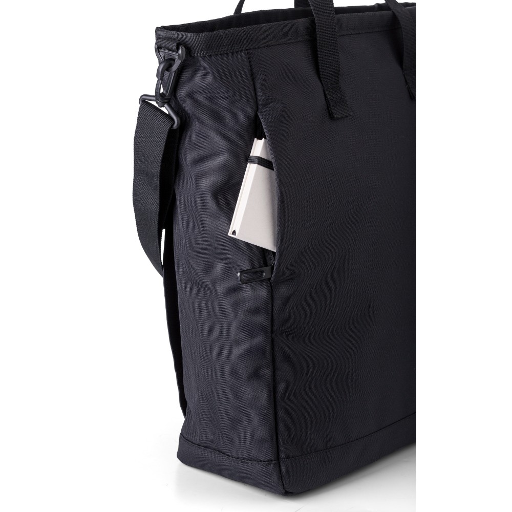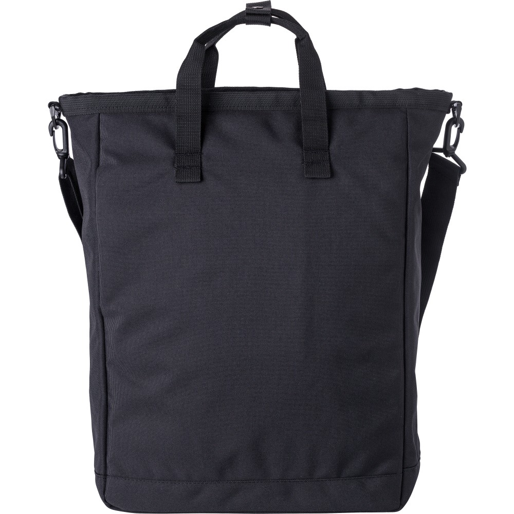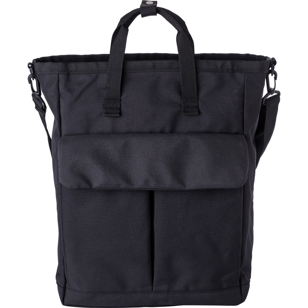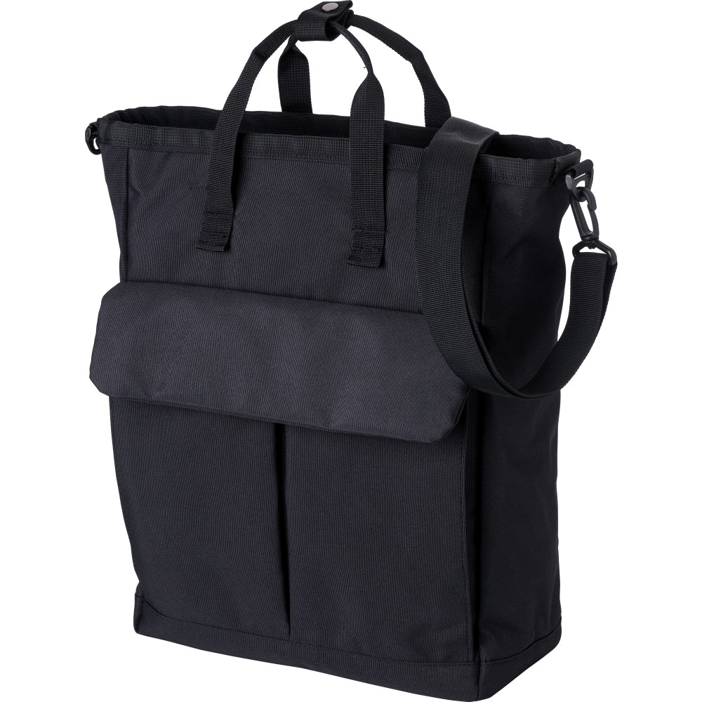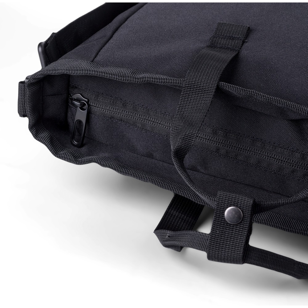 Poliészter (900D) válltáska. Két tépőzáras zseb az elülső oldalon, egy nagy cipzáras rekesz a tetején és egy cipzáras rekesz a hátoldalon. Több rekesz belül, köztük egy laptop rekesz (15 colos). A táska állítható pántokkal és rövid fogóval rendelkezik.