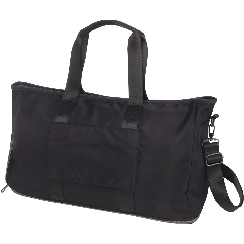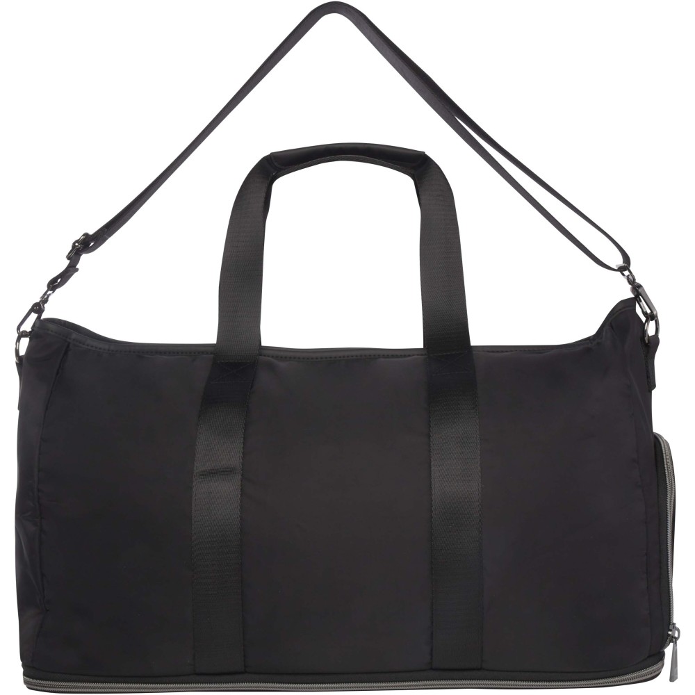 A Rhine bővíthető sporttáska stílusos kialakításával és sokoldalúságával tökéletes választás különféle alkalmakra. Kiváló minőségű, GRS tanúsítvánnyal rendelkező újrahasznosított nejlonból készült, puha RPET béléssel és prémium PU bőr elemekkel. A táska tágas főrekesszel rendelkezik, amely egy nagy, szivárgásmentes TPU zsebet, két nyitott zsebet és egy dedikált cipőtartó rekeszt tartalmaz. A hátoldalon található egy biztonságos rejtett zseb, amely egyben bőröndpántként is funkcionál. Az állítható, levehető vállpánt maximális kényelmet biztosít. A táska különlegessége a bővíthető réteg, amely akár 42 literes kapacitásra növelhető. Alap kapacitása 35 liter, maximális terhelhetősége 20 kg. PVC-mentes.