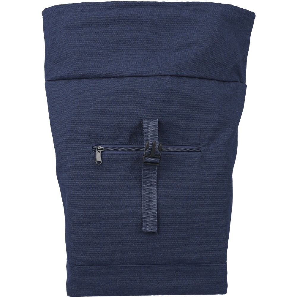 Rolltop hátizsák 330 g/m2 újahasznosított policotton anyagból, 210D poliészter béléssel és műanyag csattal. 15 literes űrtartalommal, egy nagy cipzáras rekesszel, 15"-es laptoptartó résszel, két belső és egy külső rekesszel. Tetején hordozófüllel, párnázott, állítható vállpánttal és egy kicsi, cipzáras elsőzsebbel. Teherbíró képessége 14 kg. Címkét tartalmaz.